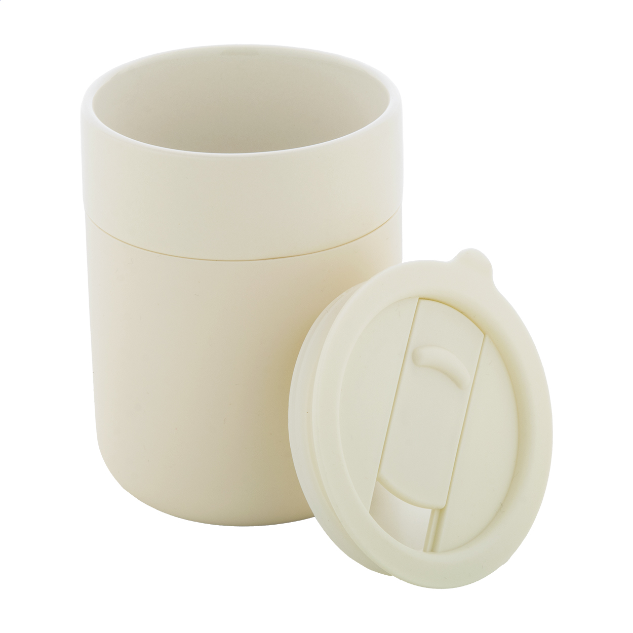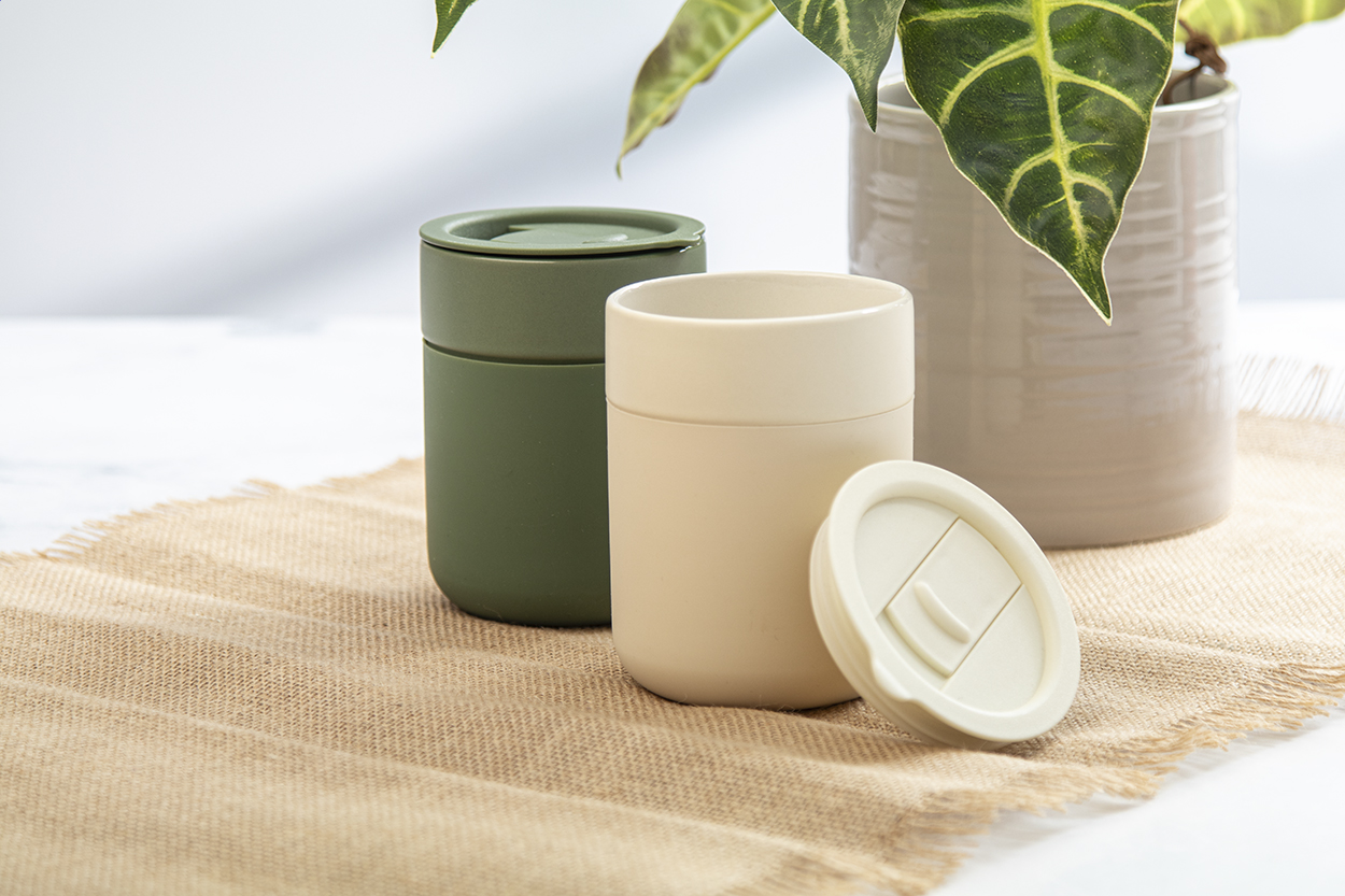 Cană de călătorie, din ceramică, acoperită cu silicon, cu capac de băut din plastic PP. 300 ml.