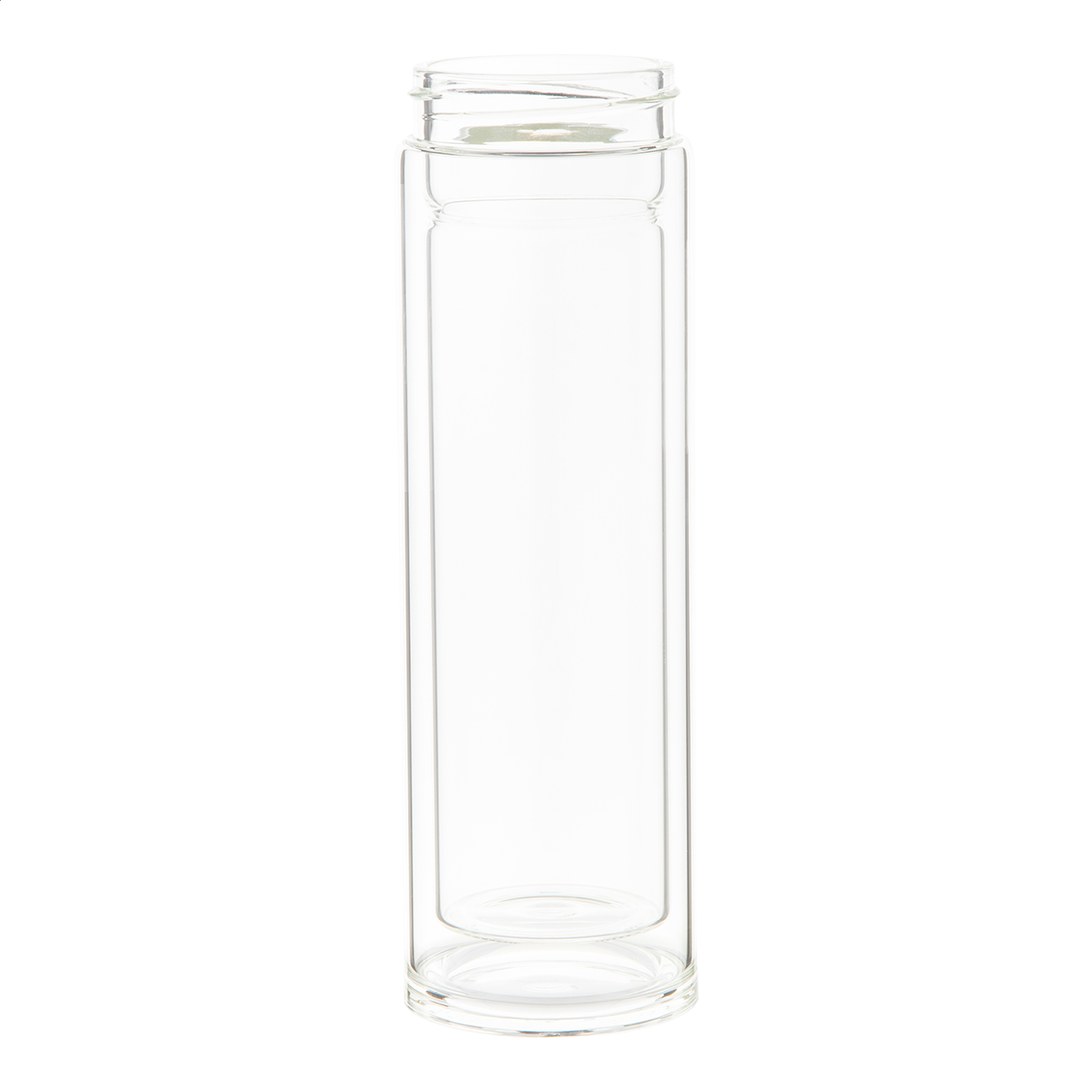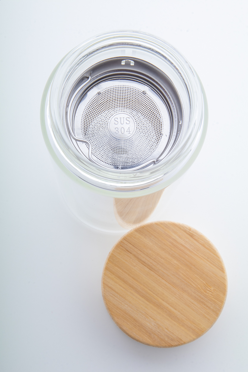 Sticlă borosilicată, termică, cu perete dublu, cu infuzor de ceai și capac de bambus. 420 ml.