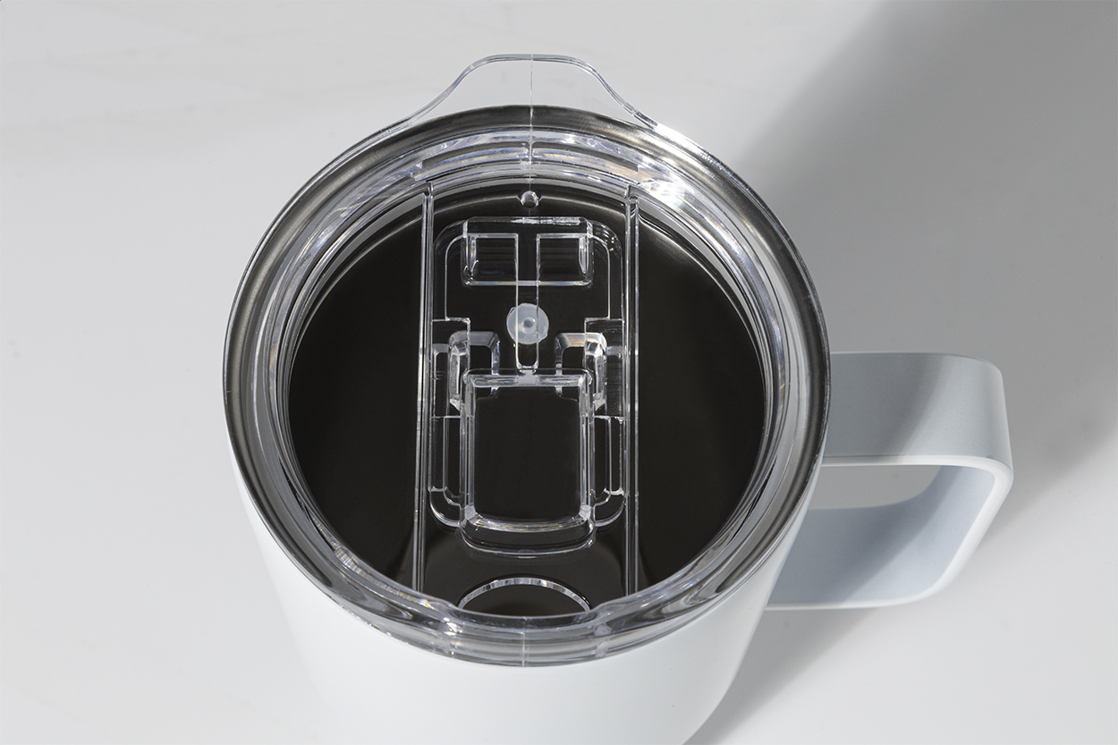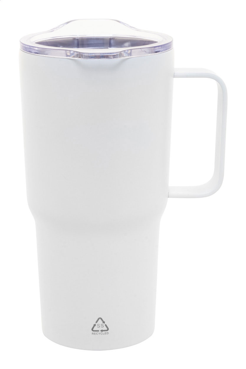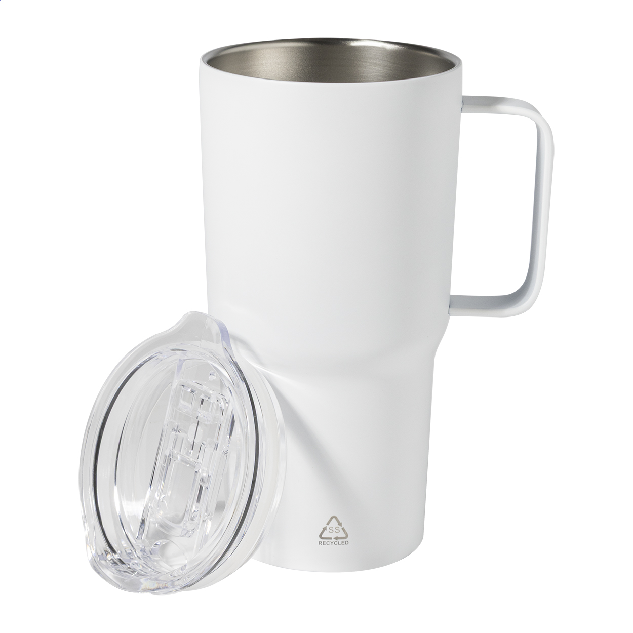 Cană termoizolată, din oțel inoxidabil reciclat, cu perete dublu, cu capac de băut din plastic PS. 600 ml.