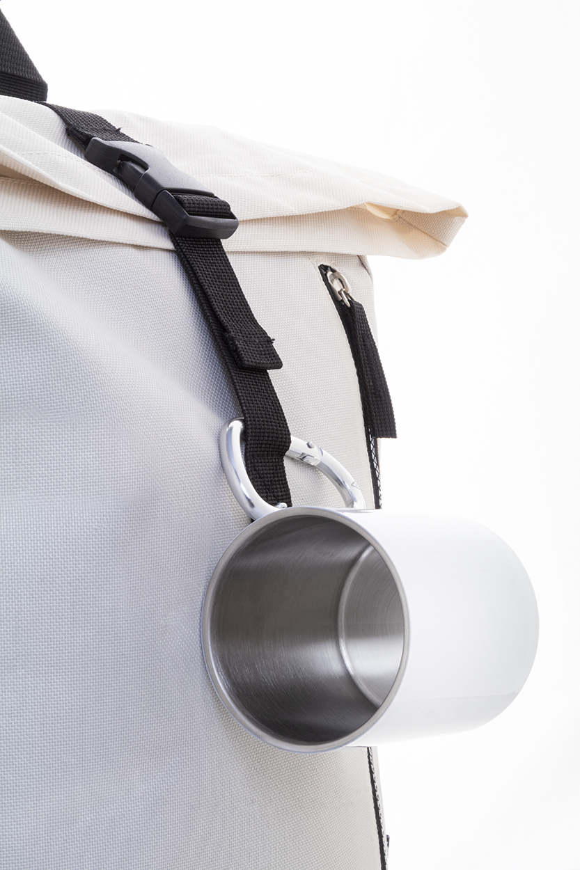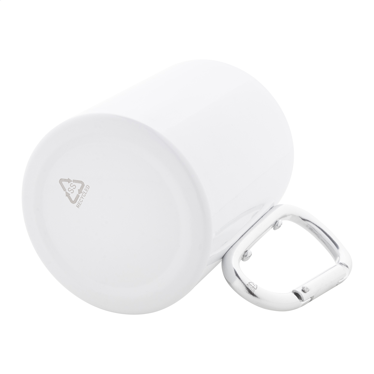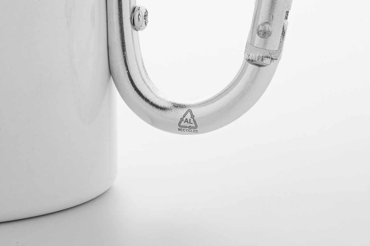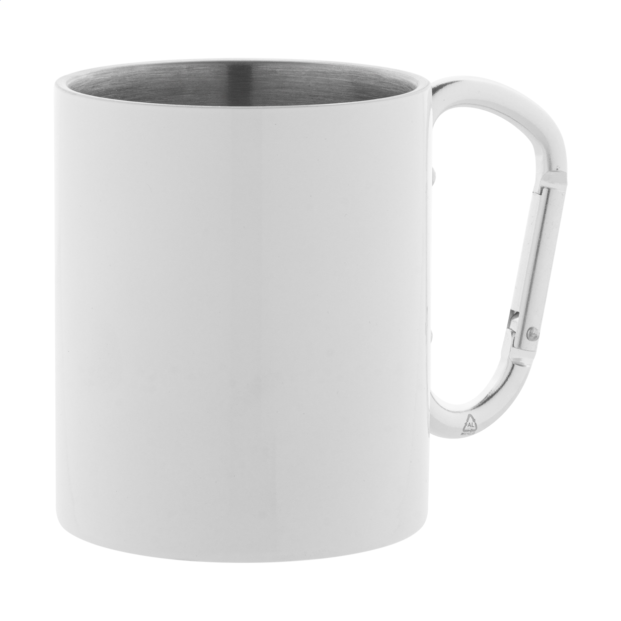 Cană termică cu perete dublu, din oțel inoxidabil reciclat, pentru sublimare, cu mâner carabină din aluminiu reciclat. 300 ml. În cutie de hârtie kraft.