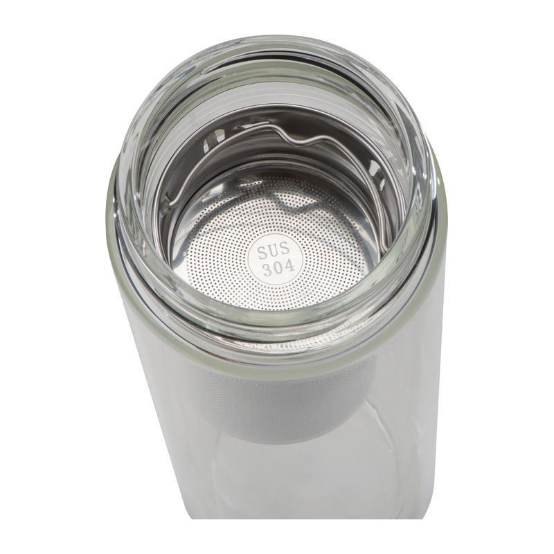 ECO friendly, double-walled vacuum glass drinking bottle with bamboo lid, filter inserted for tea or fruits with 420 ml capacity.