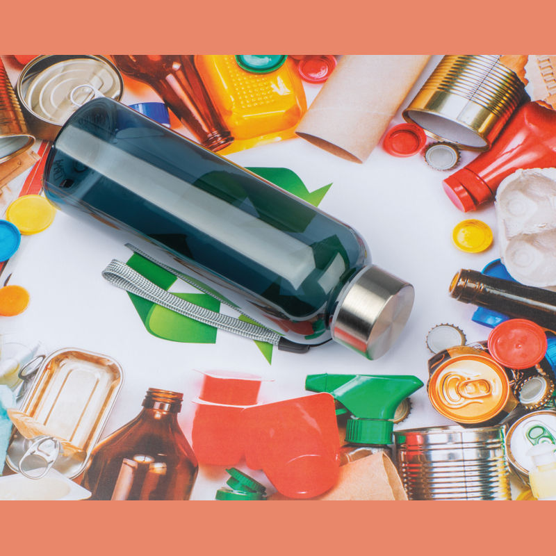 PET drinking bottle with stainless steel lid, hand loop and a capacity of 500 ml. The logo is engraved on the lid.