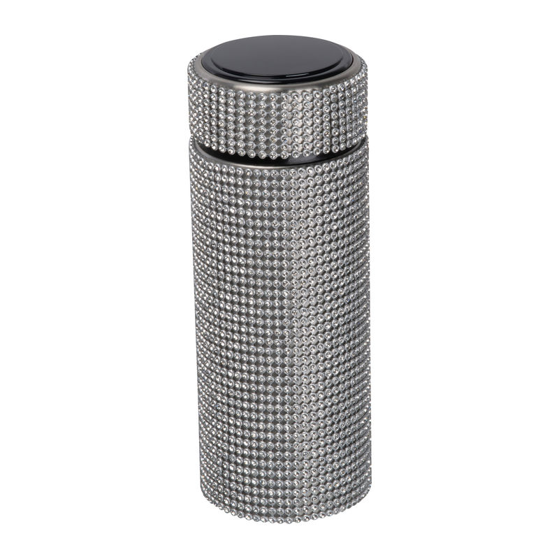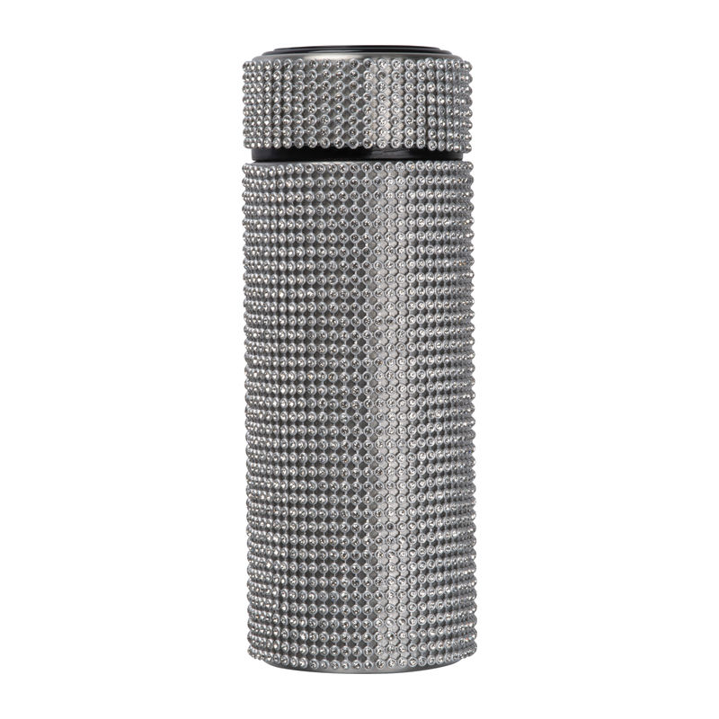 Double-walled vacuum drinking bottle made of stainless steel with sparkling rhinestone accents, a capacity of 350ml, strainer insert and a leak-proof screw cap. We print your logo on the lid.
