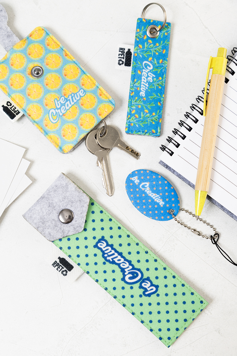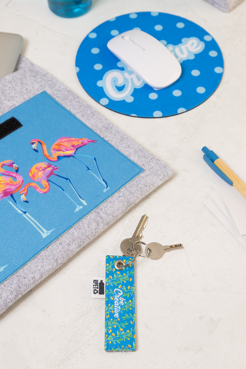 Breloc personalizat, din fetru RPET, cu partea frontală imprimată color. Cu etichetă distinctivă RPET. Pretul include imprimarea prin sublimare. MOQ: 100 buc.