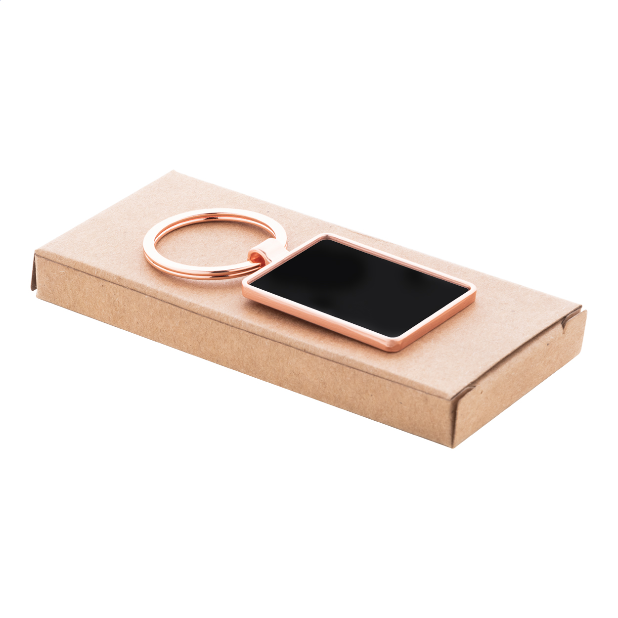 Breloc din metal, de formă dreptunghiulară, cu finisaj auriu, cu placă din metal. În cutie de hârtie kraft.