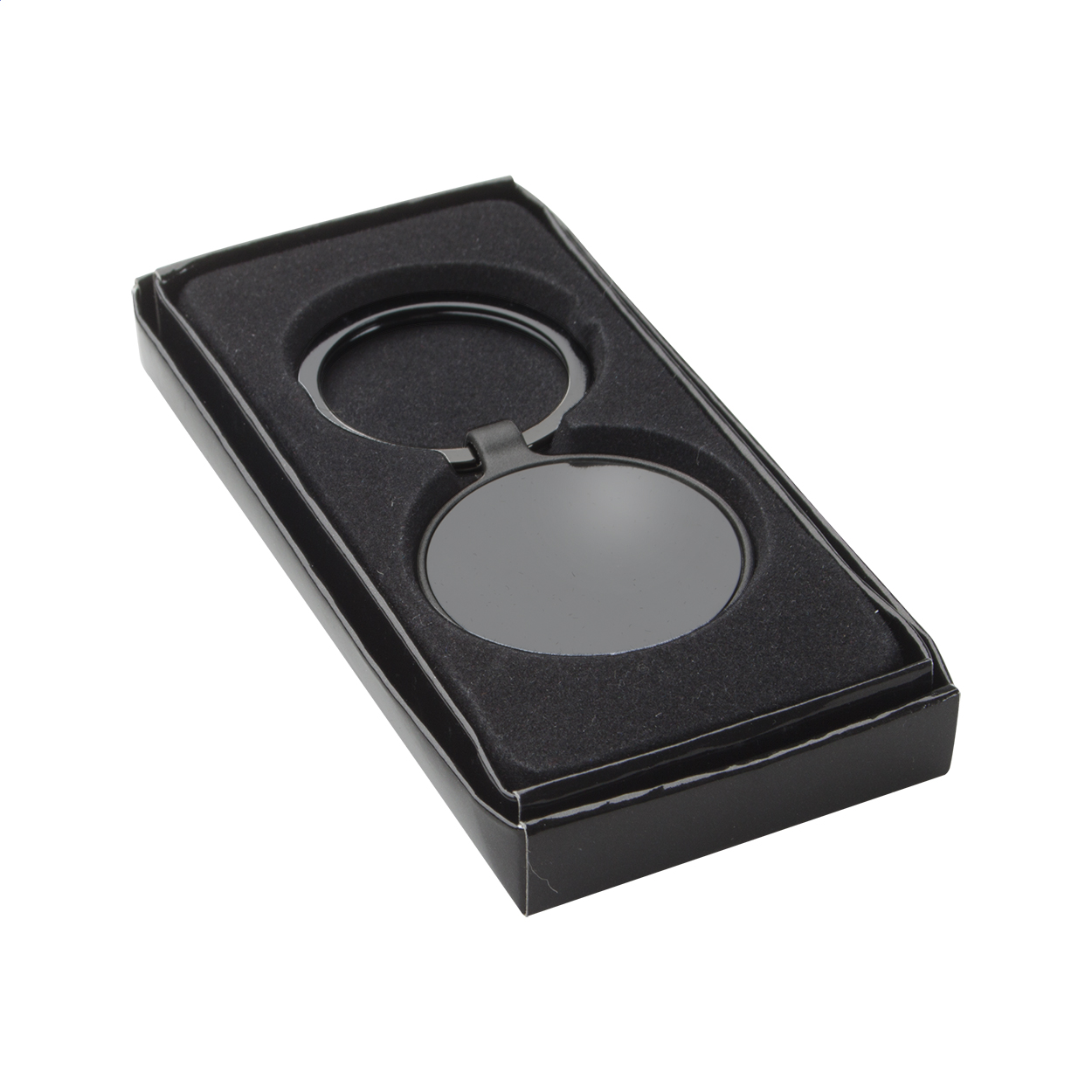 Breloc rotund din metal cu finisaj metalic și suprafeţe strălucitoare pe ambele părți.