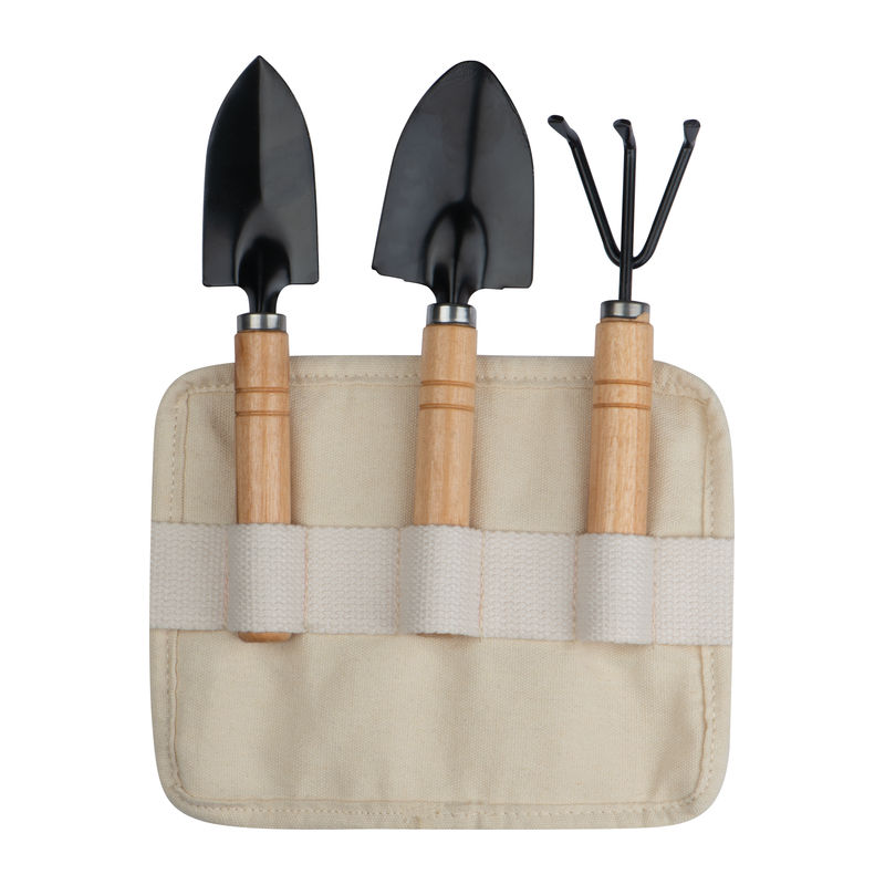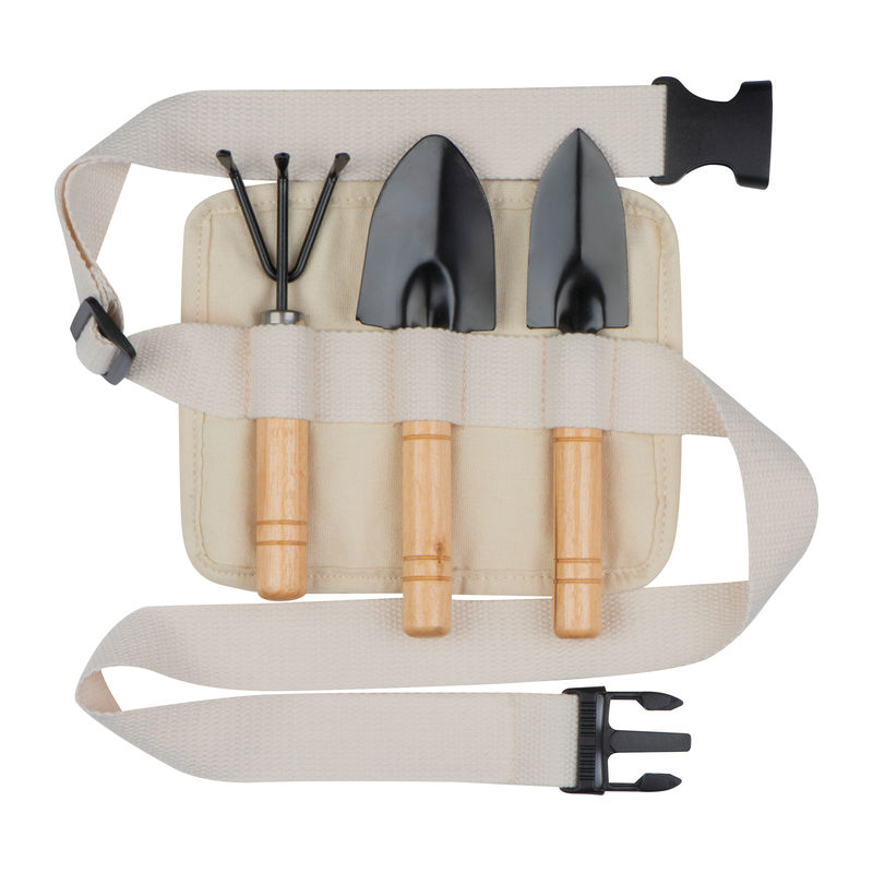 Handy garden helper! Cotton belt with click closure, rake and two different sized shovels. Your logo will be printed on the belt.