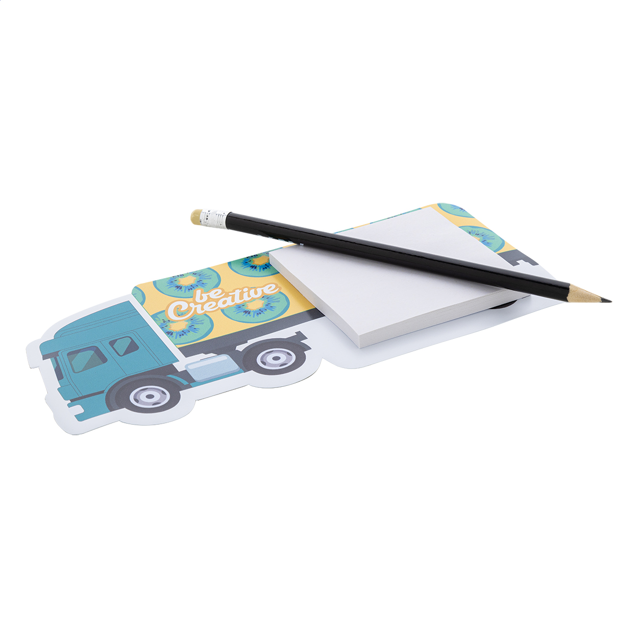 Magnet de frigider personalizat, în formă de camion, imprimat color, cu blocnotes autoadeziv. Include 50 de note autoadezive din hârtie reciclată (75×75 mm). Cantitate minimă: 100 buc.