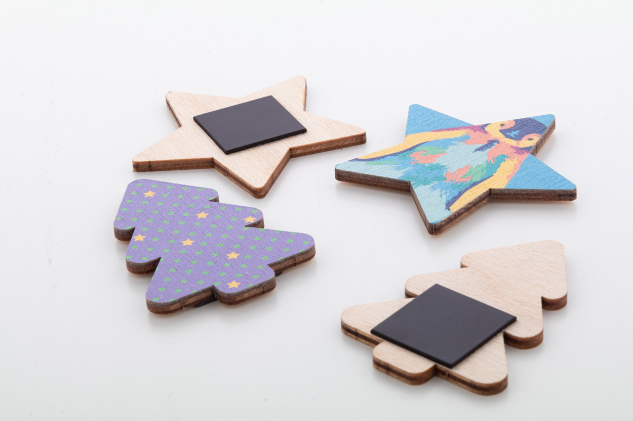 Magnet pentru frigider, de Crăciun, din placaj de mesteacăn, realizat la comandă, cu imprimare color. Prețul include imprimarea UV LED. MOQ: 200 buc.