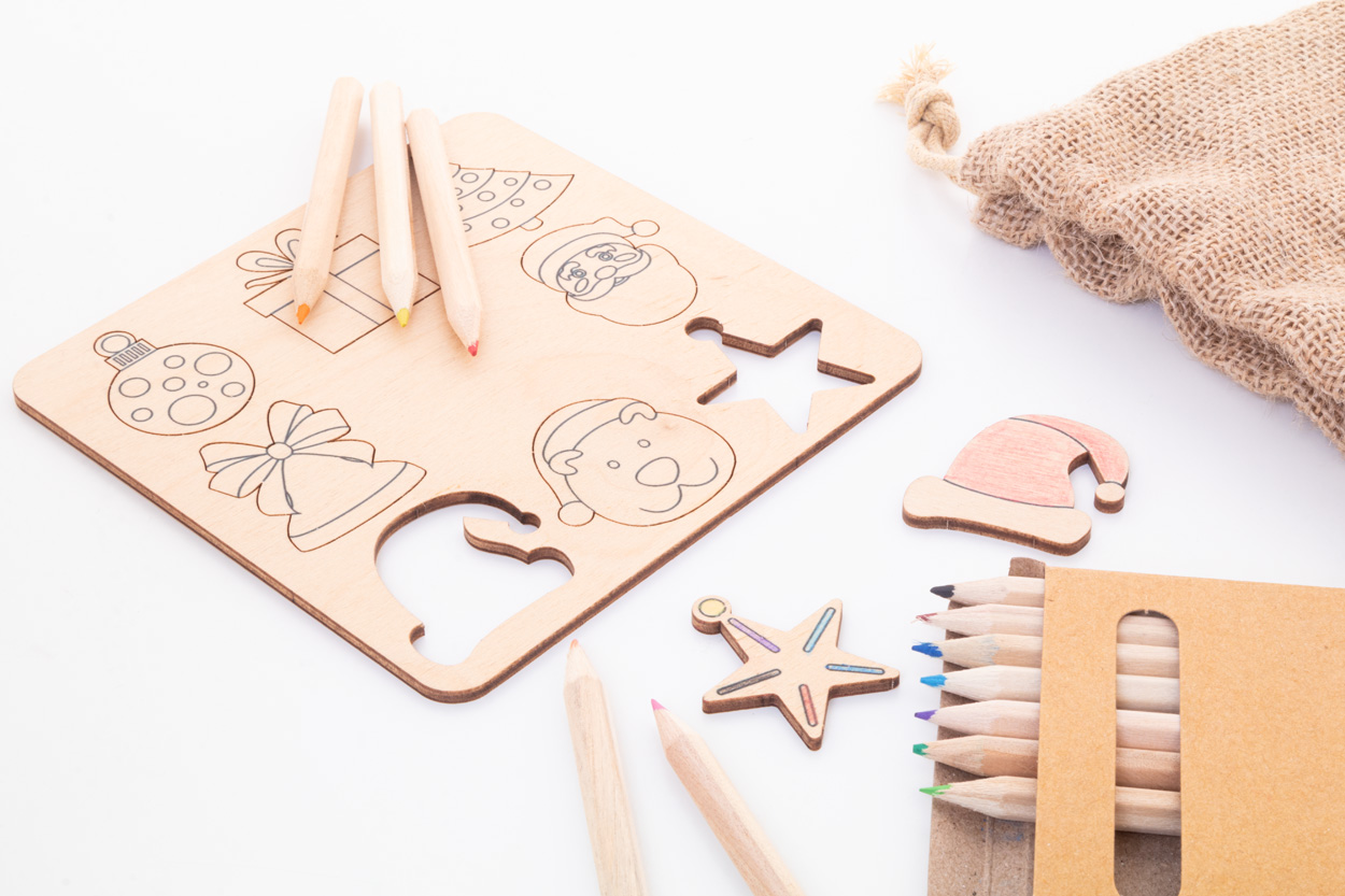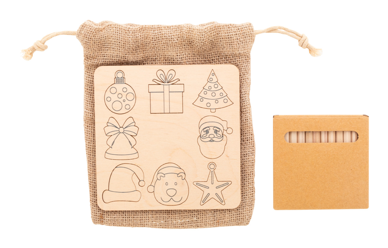 Joc de potrivire a formelor, de colorat, cu motive de Crăciun, din placaj de mesteacăn cu husă de transport din iută. Include figurine decupate tematice (8 buc) si creioane colorate din lemn (12 buc) in cutie de hârtie.