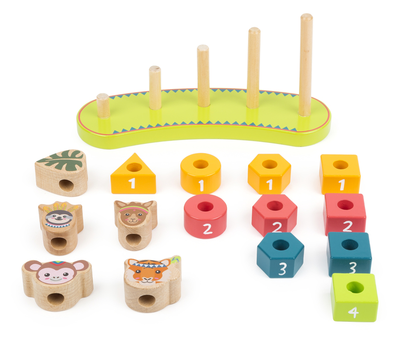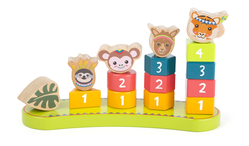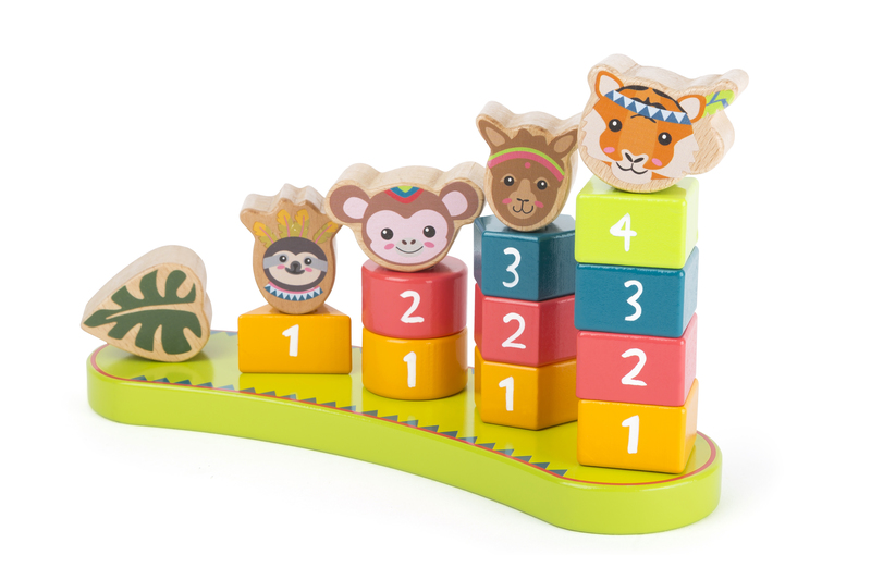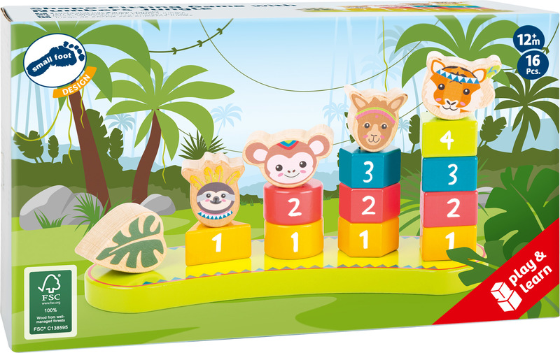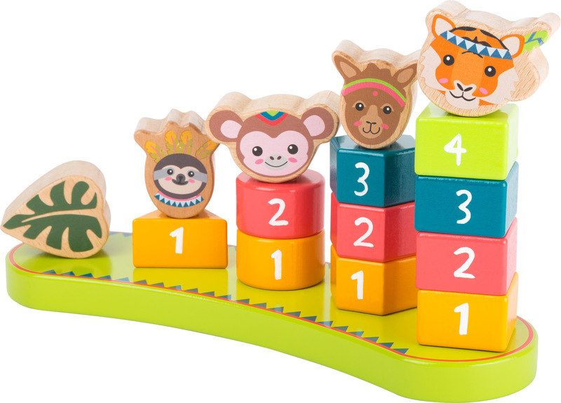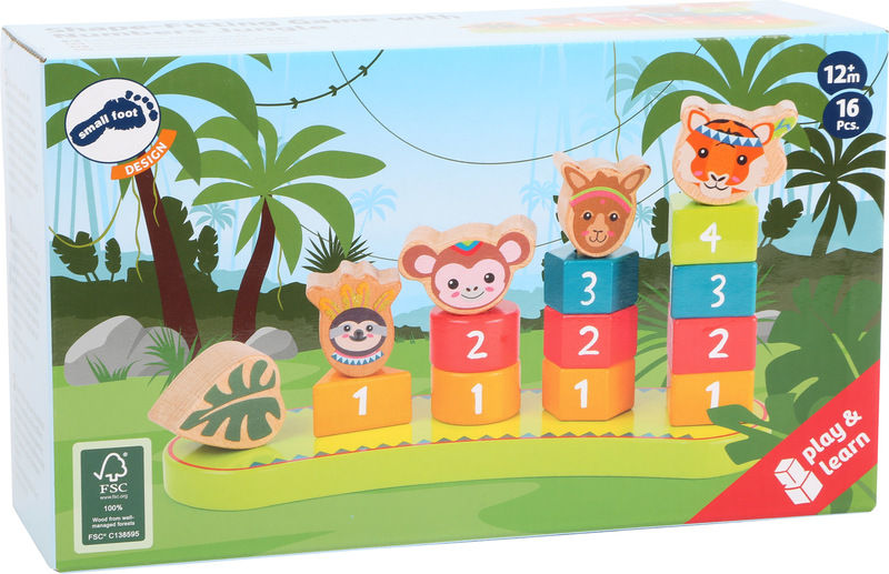 A fun Jungle shape-fitting game. These cute animals watch over the number cubes made of FSC? 100%-certified wood. But they?ll gladly come down from their thrones so that the young math whizzes can prove their understanding of numbers. This is how the correct stacking of numbers and shapes is taught. All high-stackers can get going now!