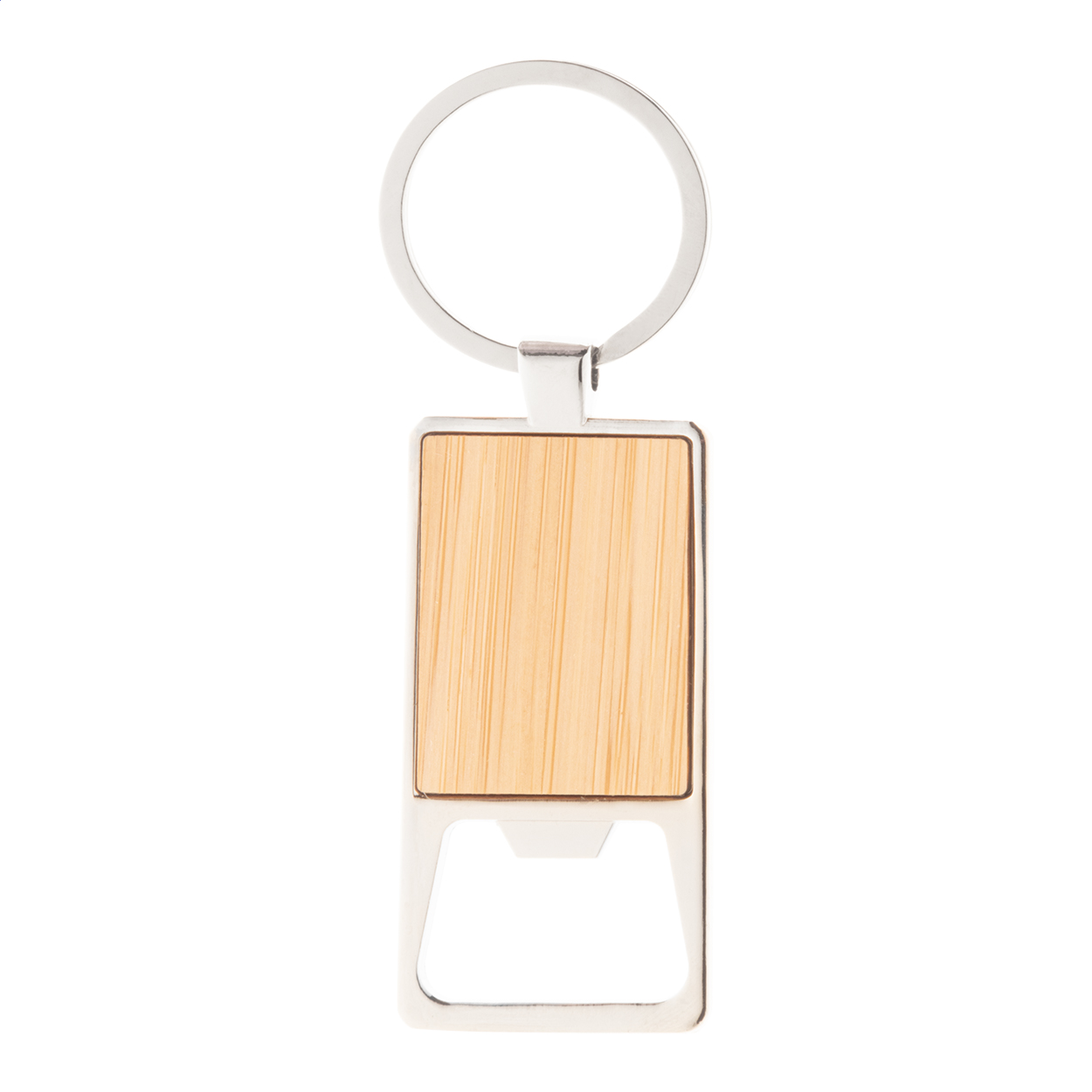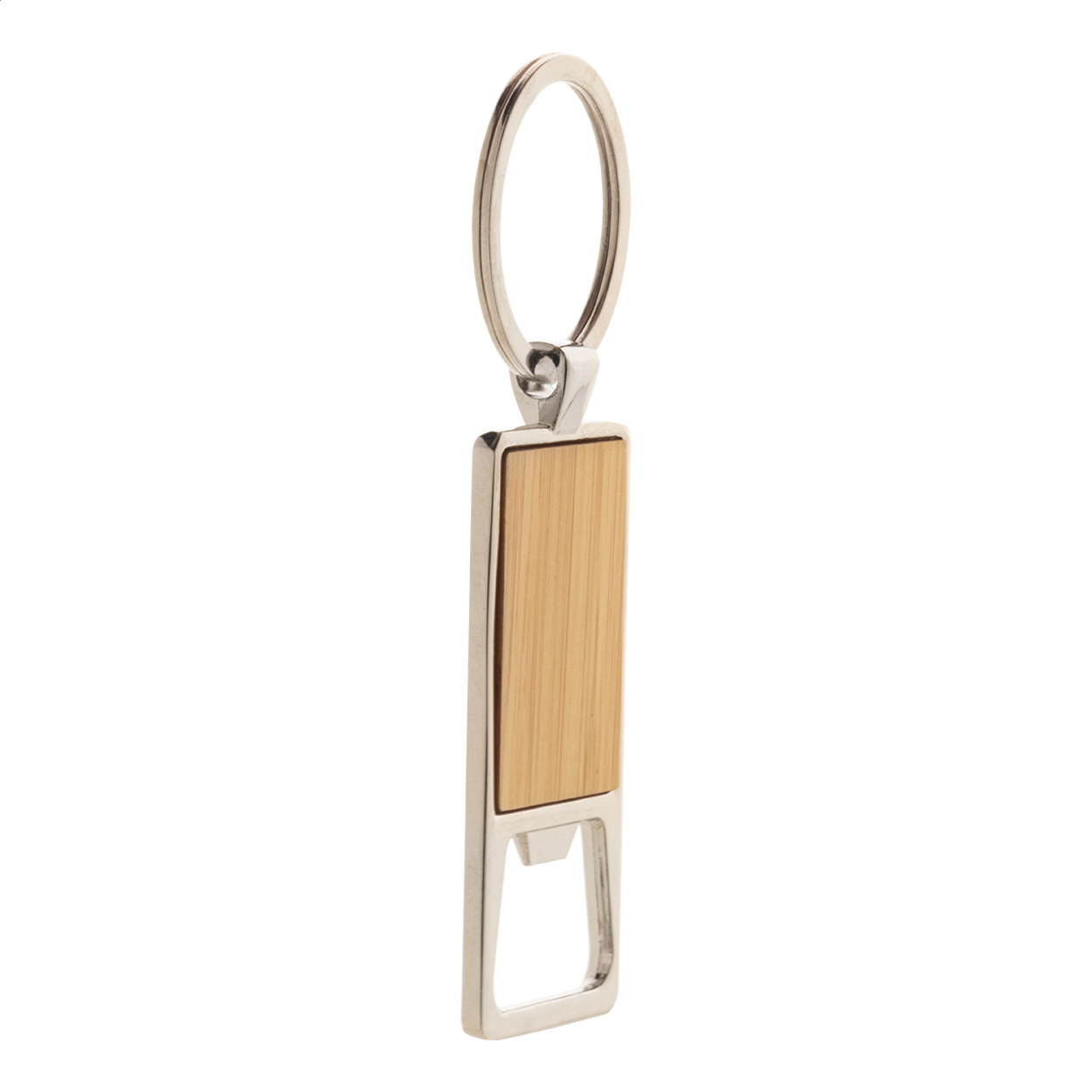 Metal keyring with bamboo insert and bottle opener.