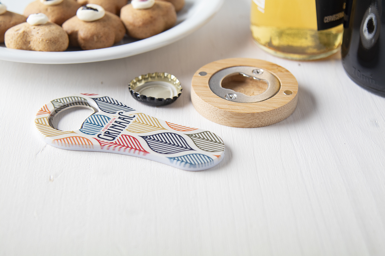Round shaped bamboo fridge magnet with bottle opener.