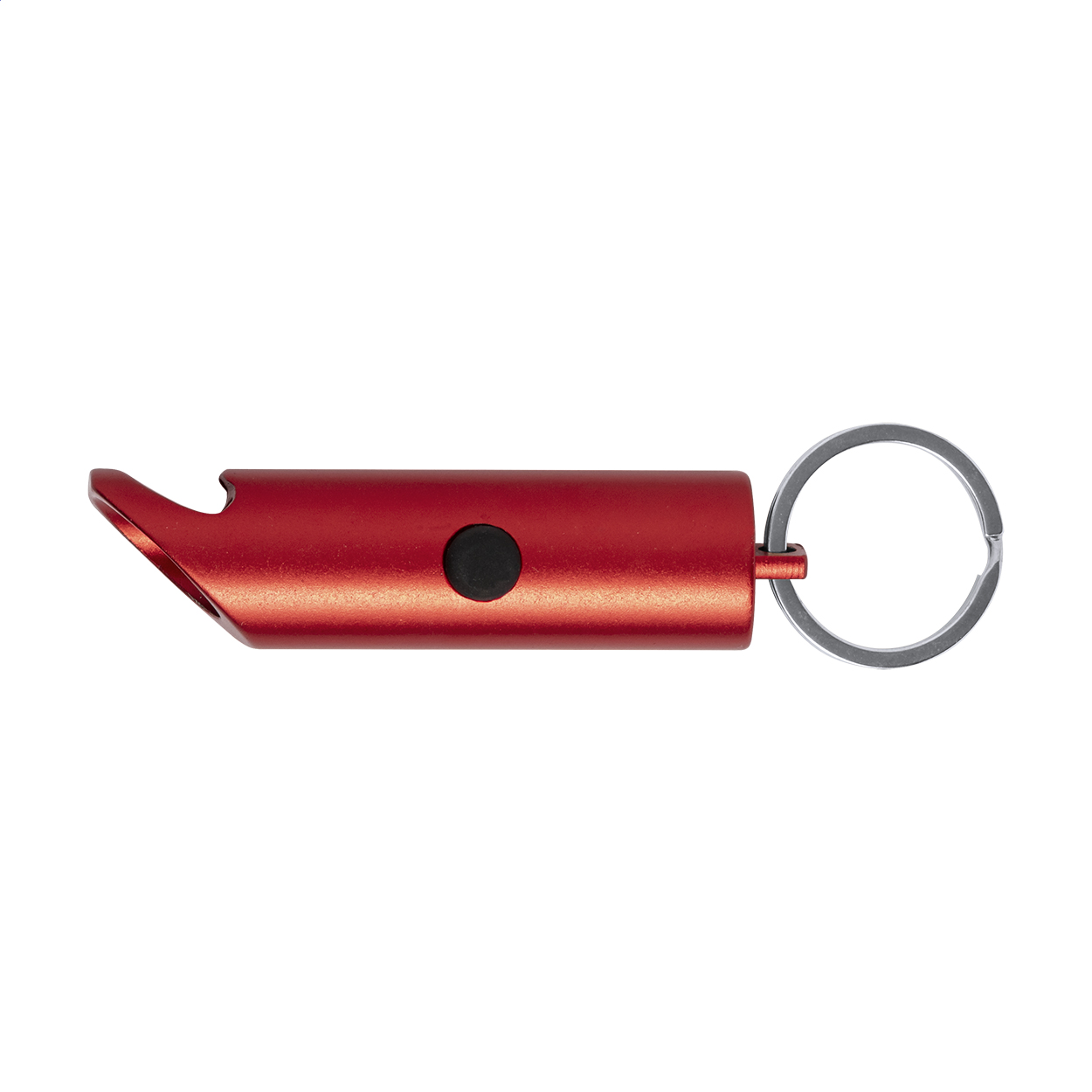 Mini, recycled aluminium flashlight with 3 LED, bottle opener and keyring. With button cell battery.