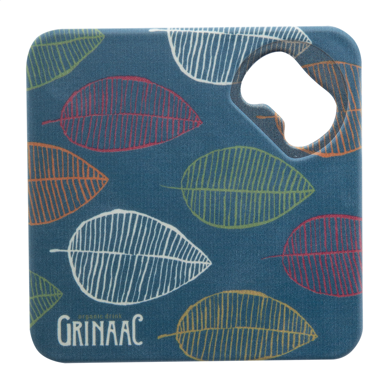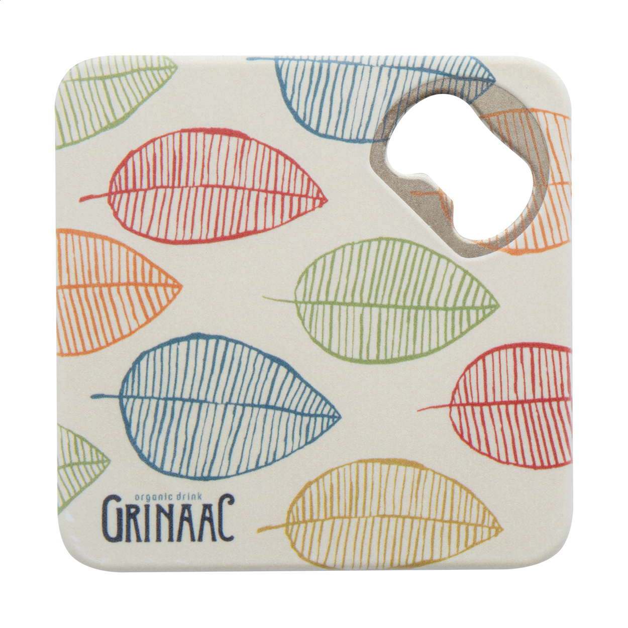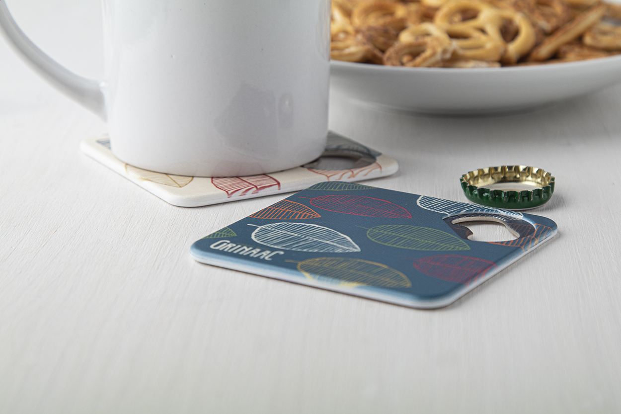 Plastic coaster with metal bottle opener and non-slip bottom.