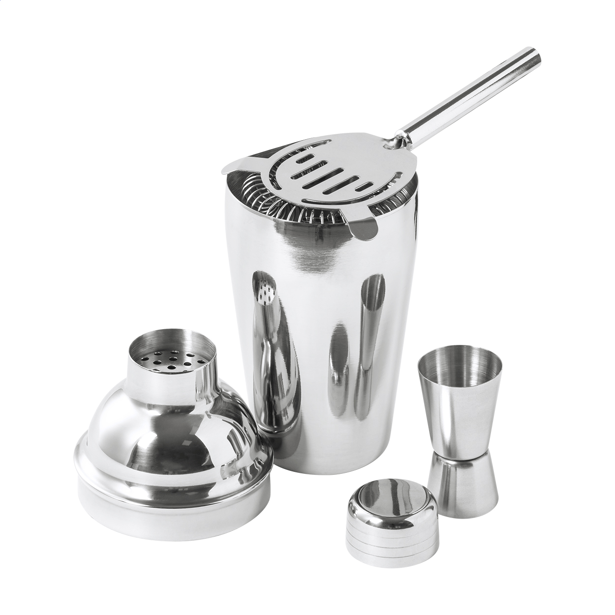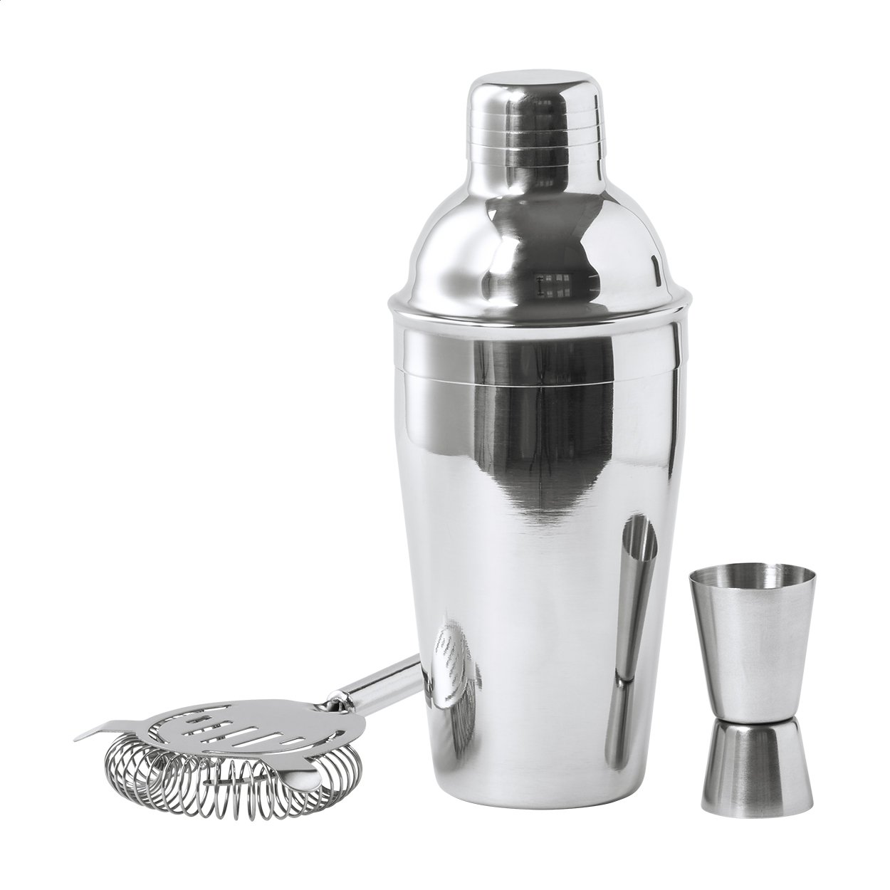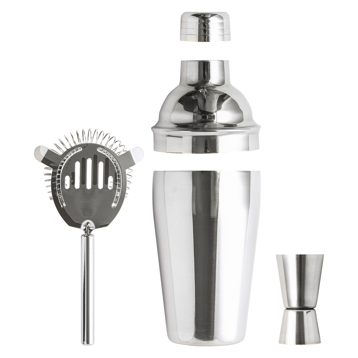 Stainless steel cocktail set with 550 ml shaker, measuring jigger and cocktail strainer.