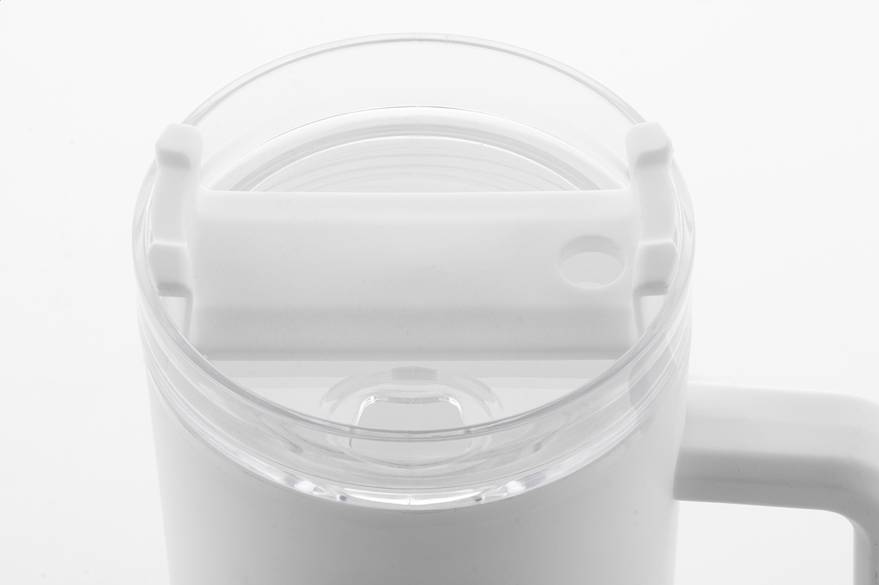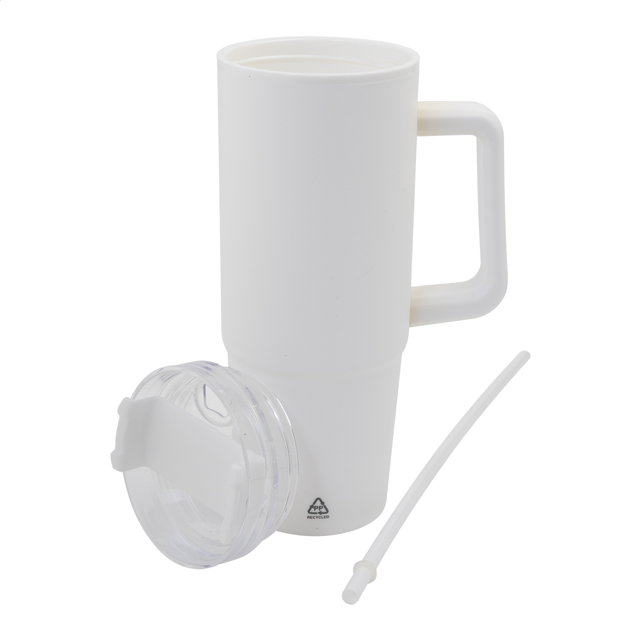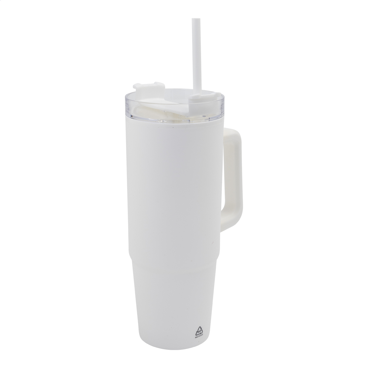 Double-wall, recycled PP plastic insulated thermo mug with plastic drinking lid and straw. 900 ml.