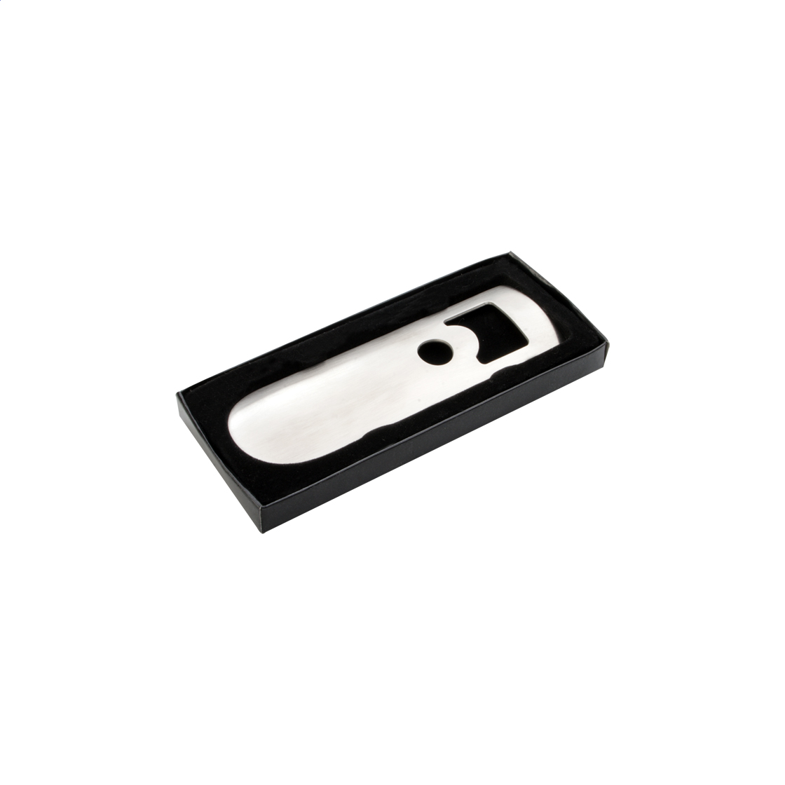 Metal bottle opener in black carton box.