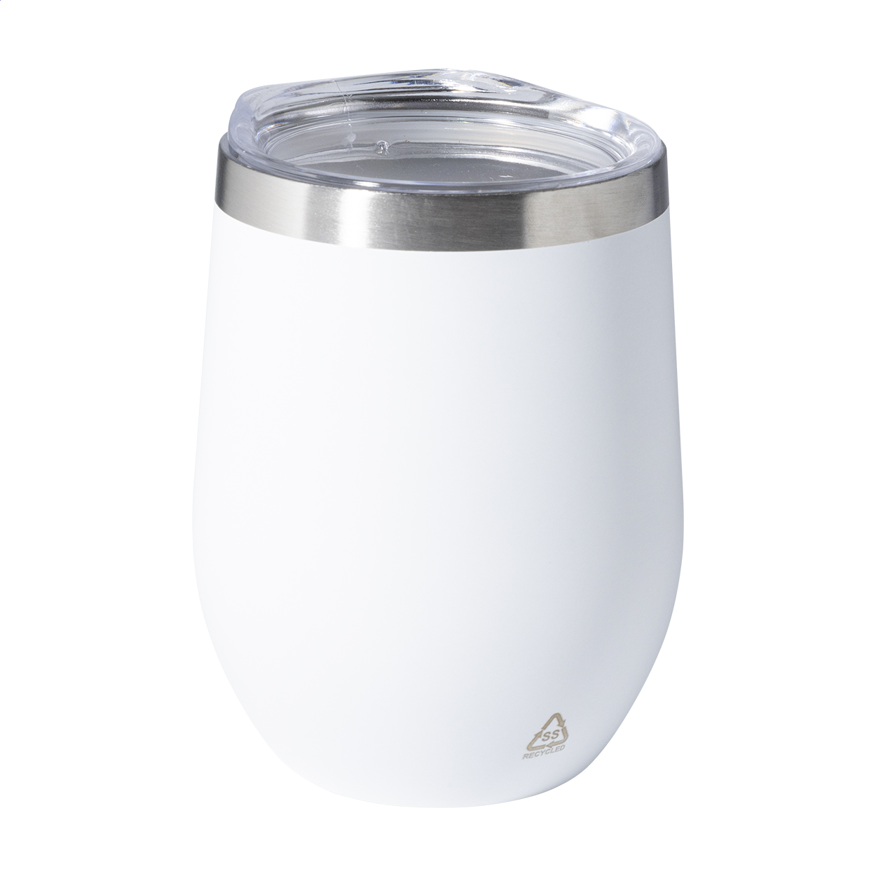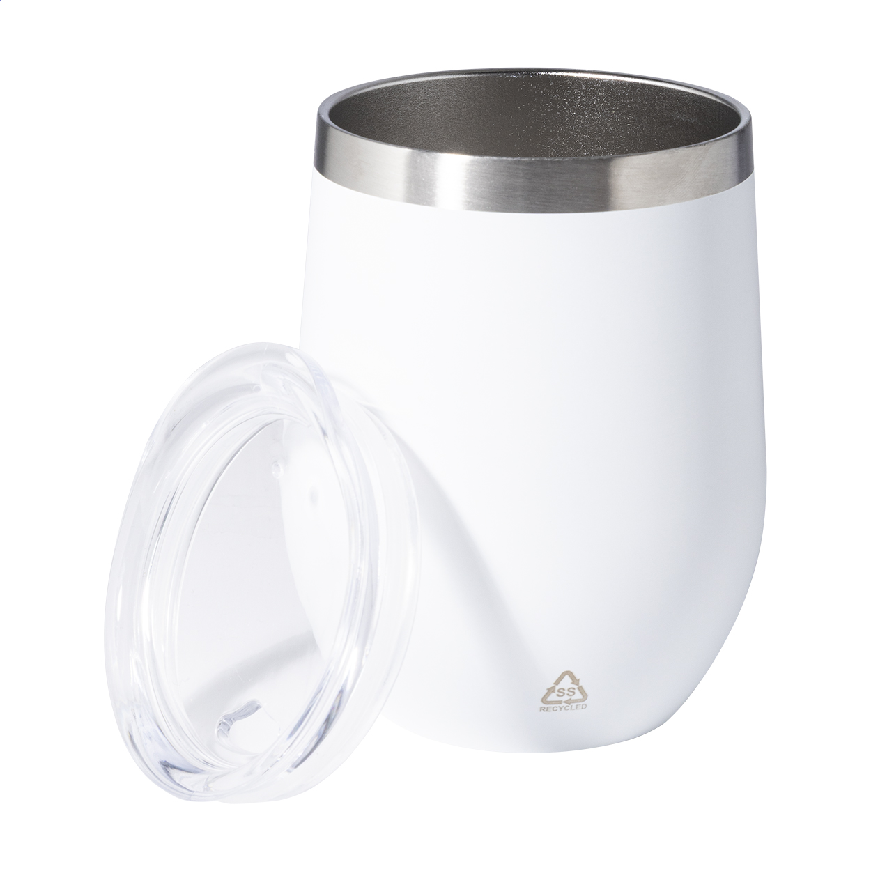 Double-wall, recycled stainless steel thermo cup with plastic drinking lid. 350 ml.