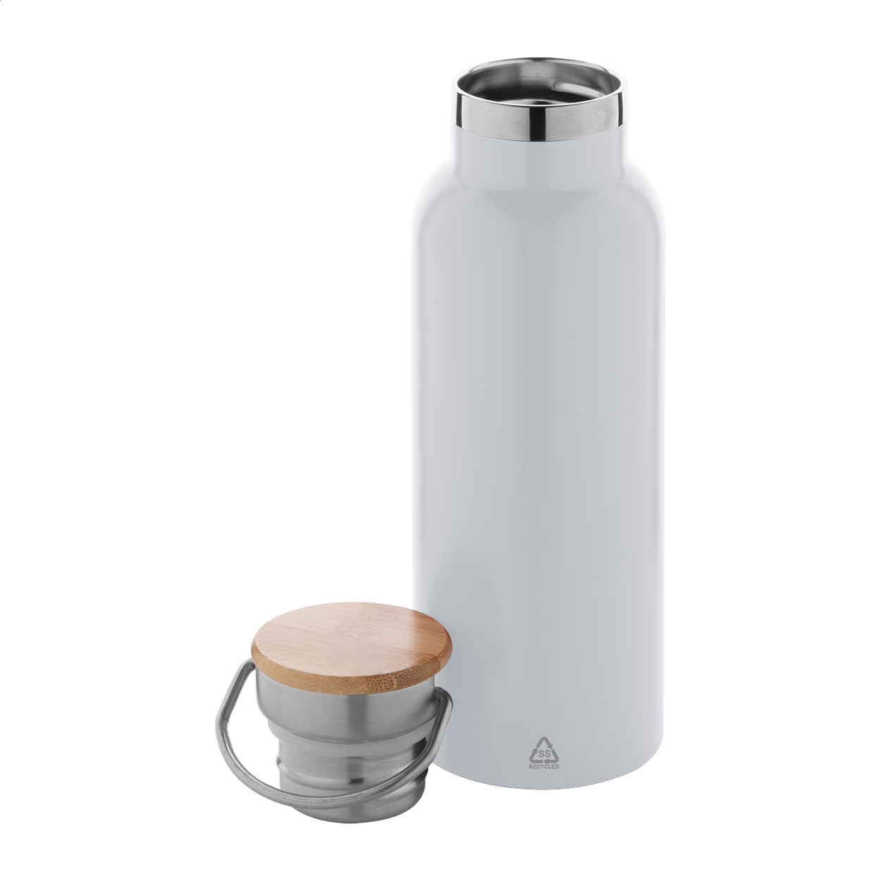 Double-wall, recycled stainless steel vacuum insulated bottle with bamboo carry lid. 500 ml.