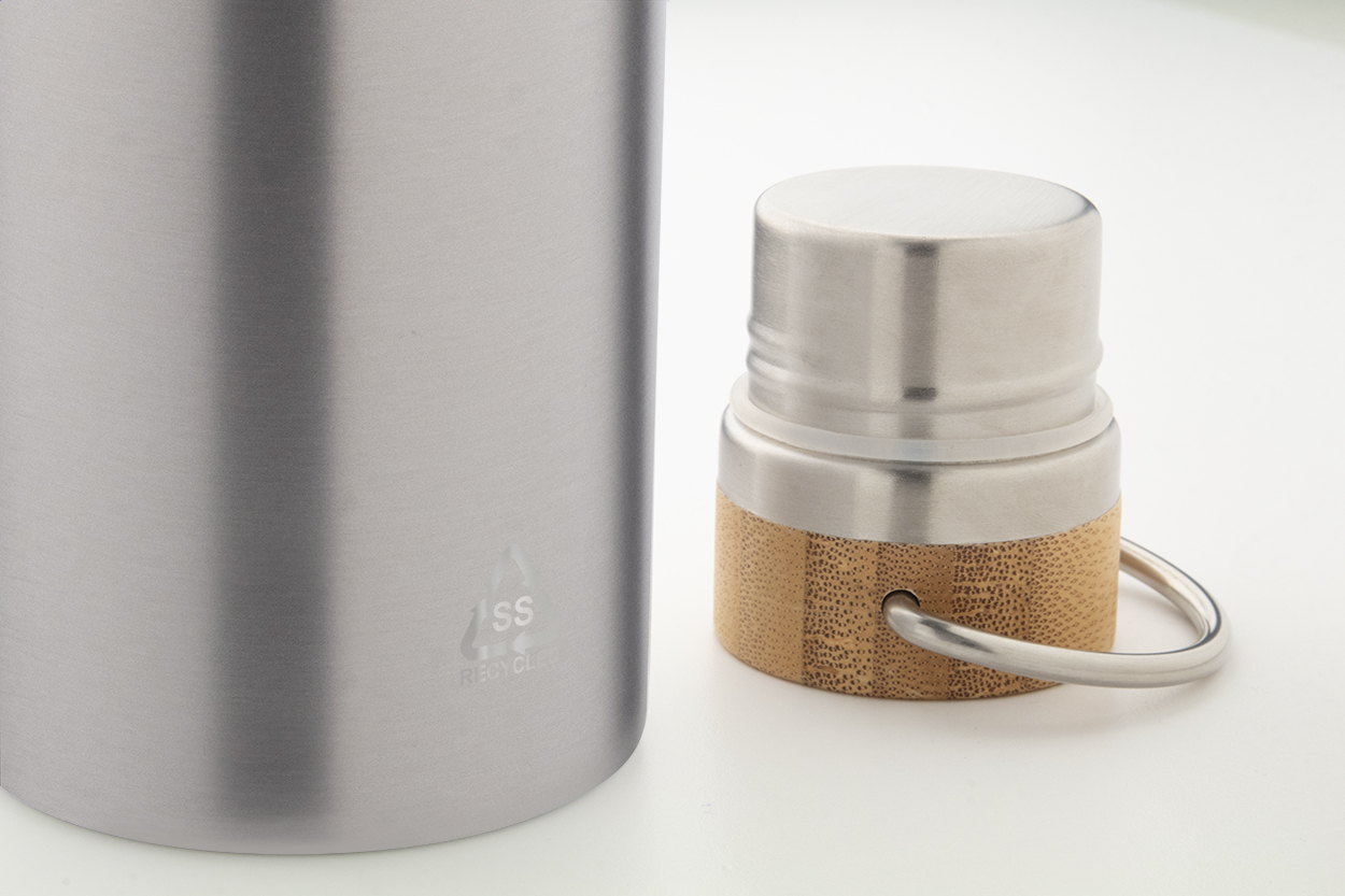 Double-wall, recycled stainless steel vacuum insulated bottle with bamboo carry lid, 500 ml.