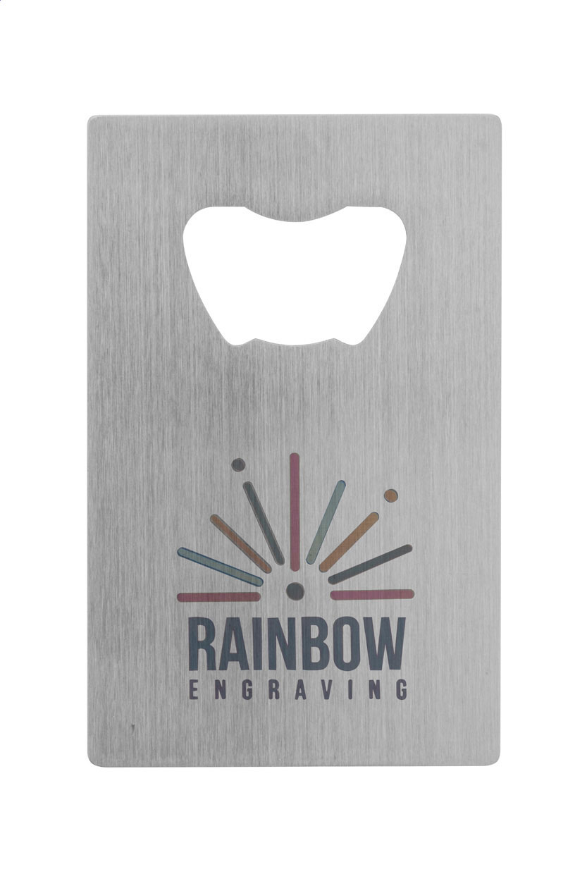 Stainless steel, credit card-shaped bottle opener.