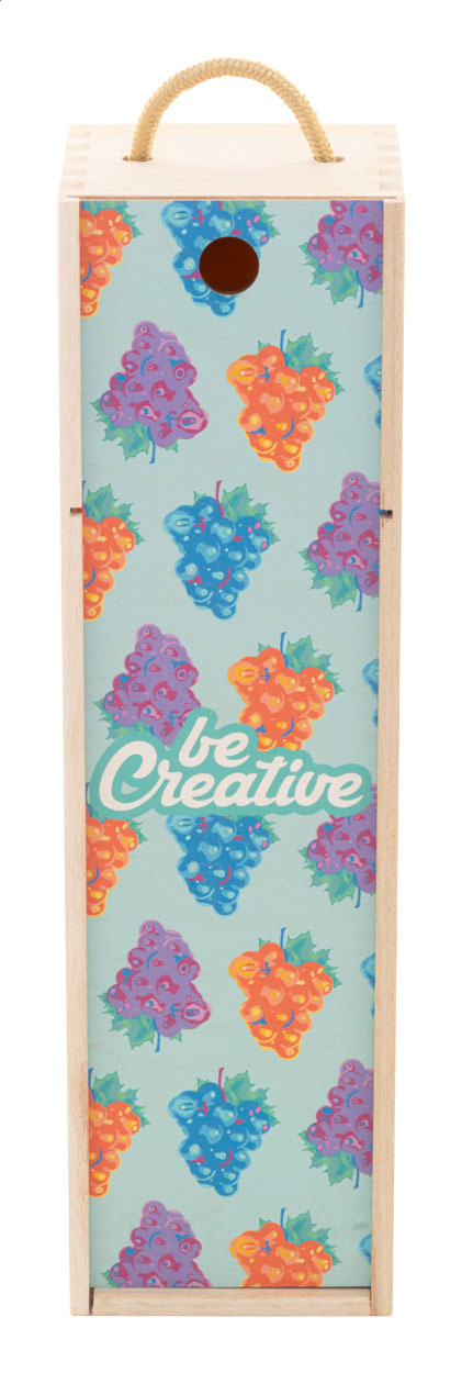 Custom made, wooden wine gift box with cord handle and full colour printed lid. Price includes UV LED printing. MOQ: 50 pcs.