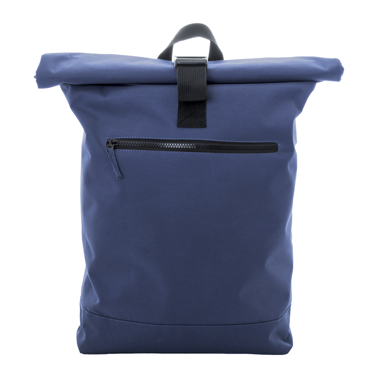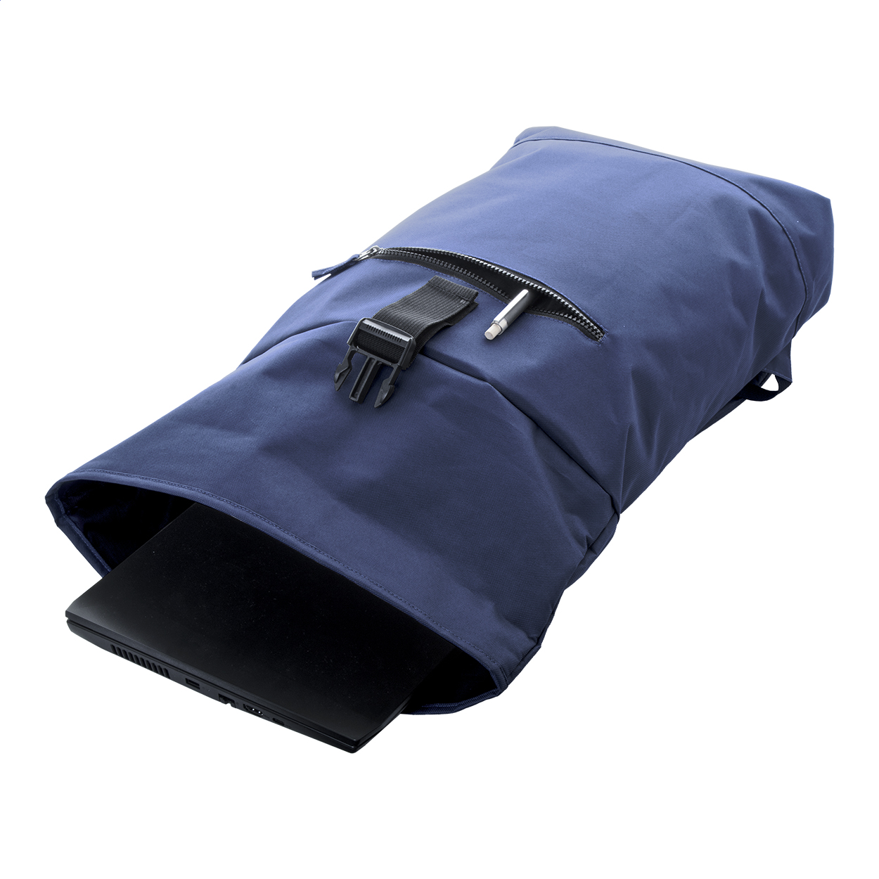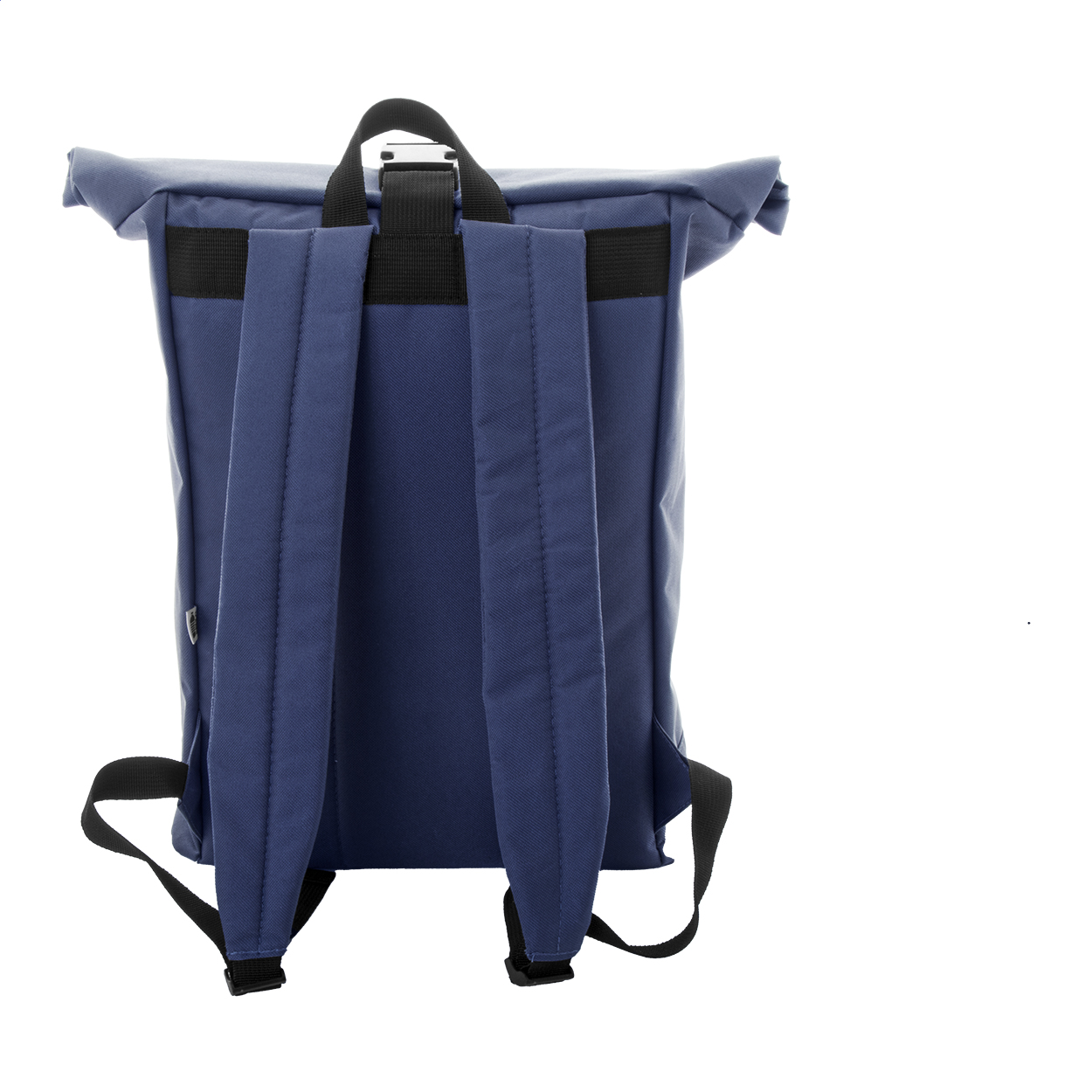 RPET rolltop backpack with buckle closure, zipped front pocket, padded laptop (15") compartment, padded back and shoulder straps. 600D RPET polyester with distinctive RPET label.
