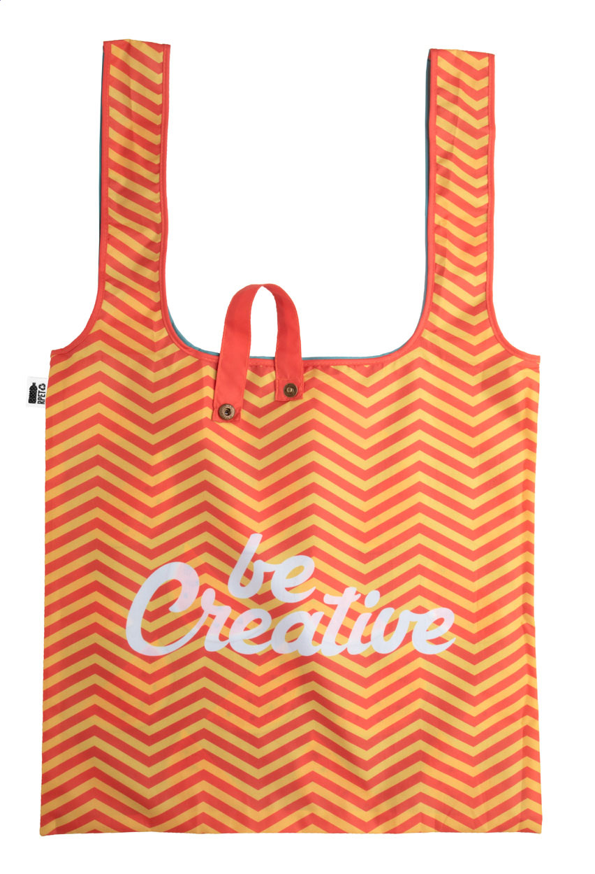 Custom made, foldable shopping bag in 190T RPET polyester. With all over sublimation printed graphics and distinctive RPET label. MOQ: 25 pcs.