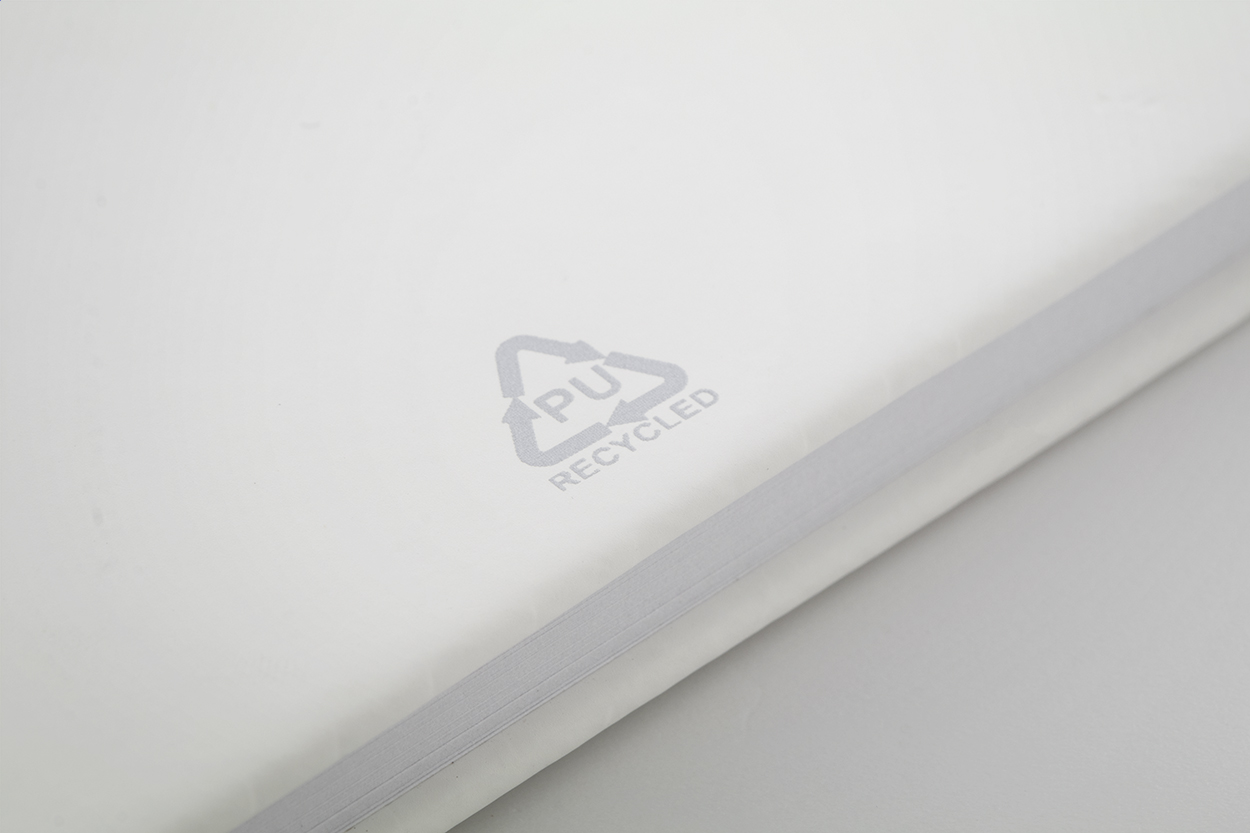 Recycled PU leather covered notebook with 100 blank sheets in recycled paper. With matching colour bookmark and rubber band. A5 size.