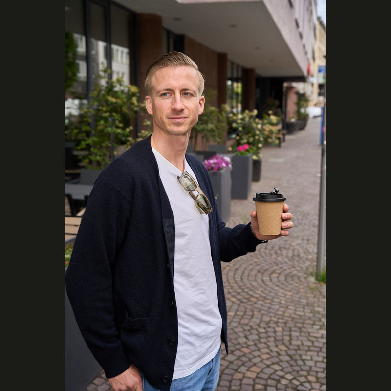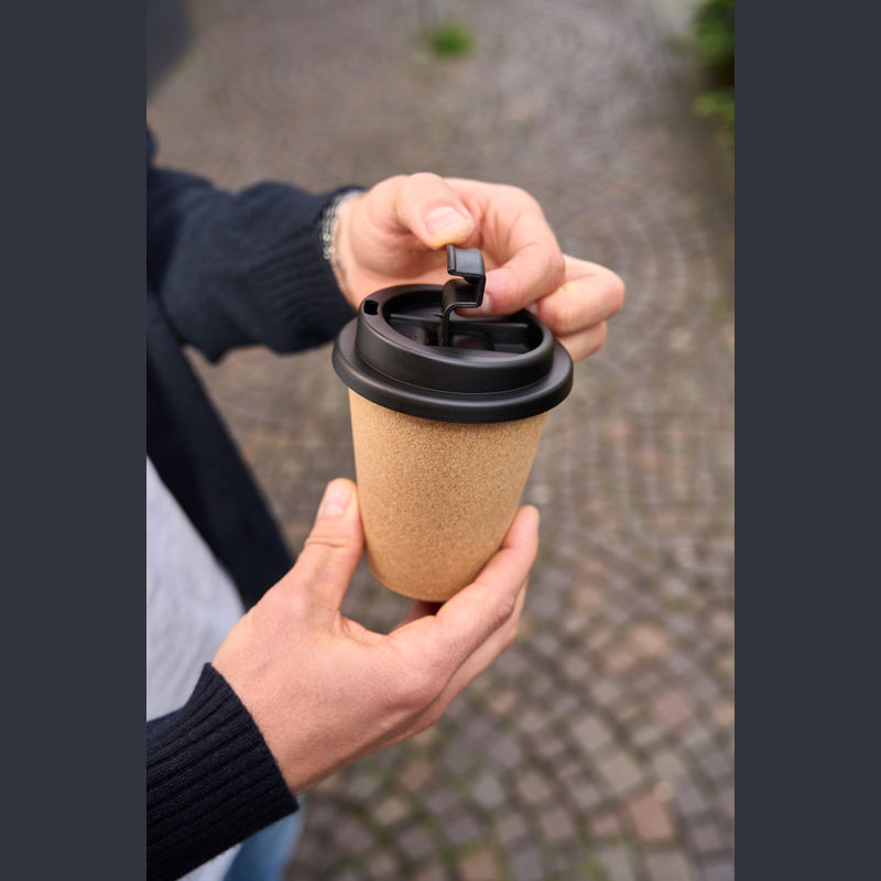 Leak-proof drinking mug featuring a cork coating and a lockable mouthpiece, with a capacity of 350 ml. Supplied individually packaged in a cardboard box.