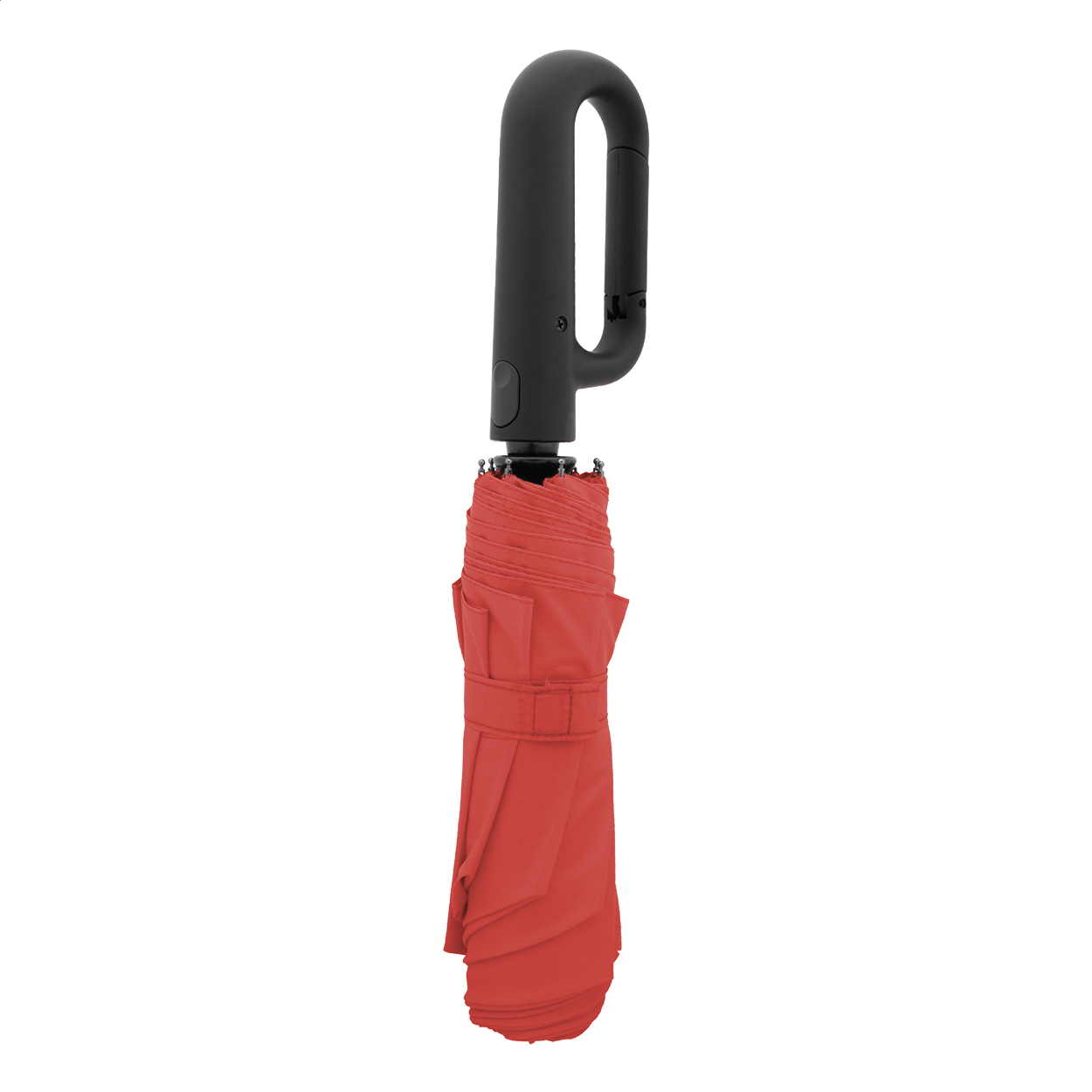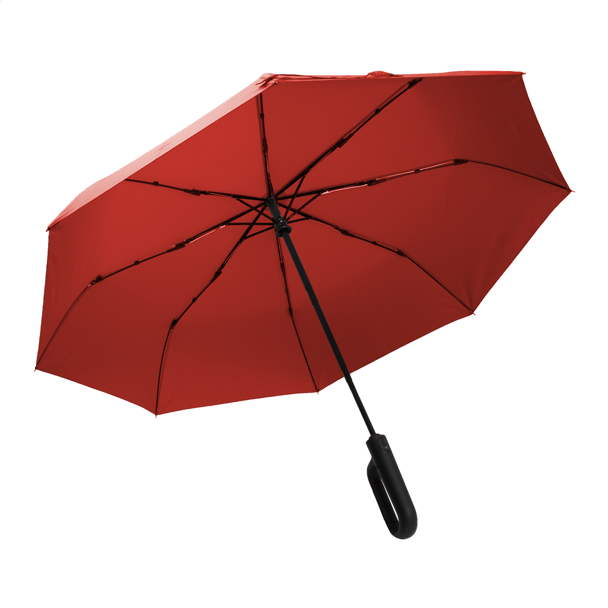 Full automatic (open/close), windproof folding umbrella with 8 panels in matching colour pouch. With metal frame, fibreglass ribs and rubberized carabiner loop handle. 190T RPET pongee. With distinctive RPET label.