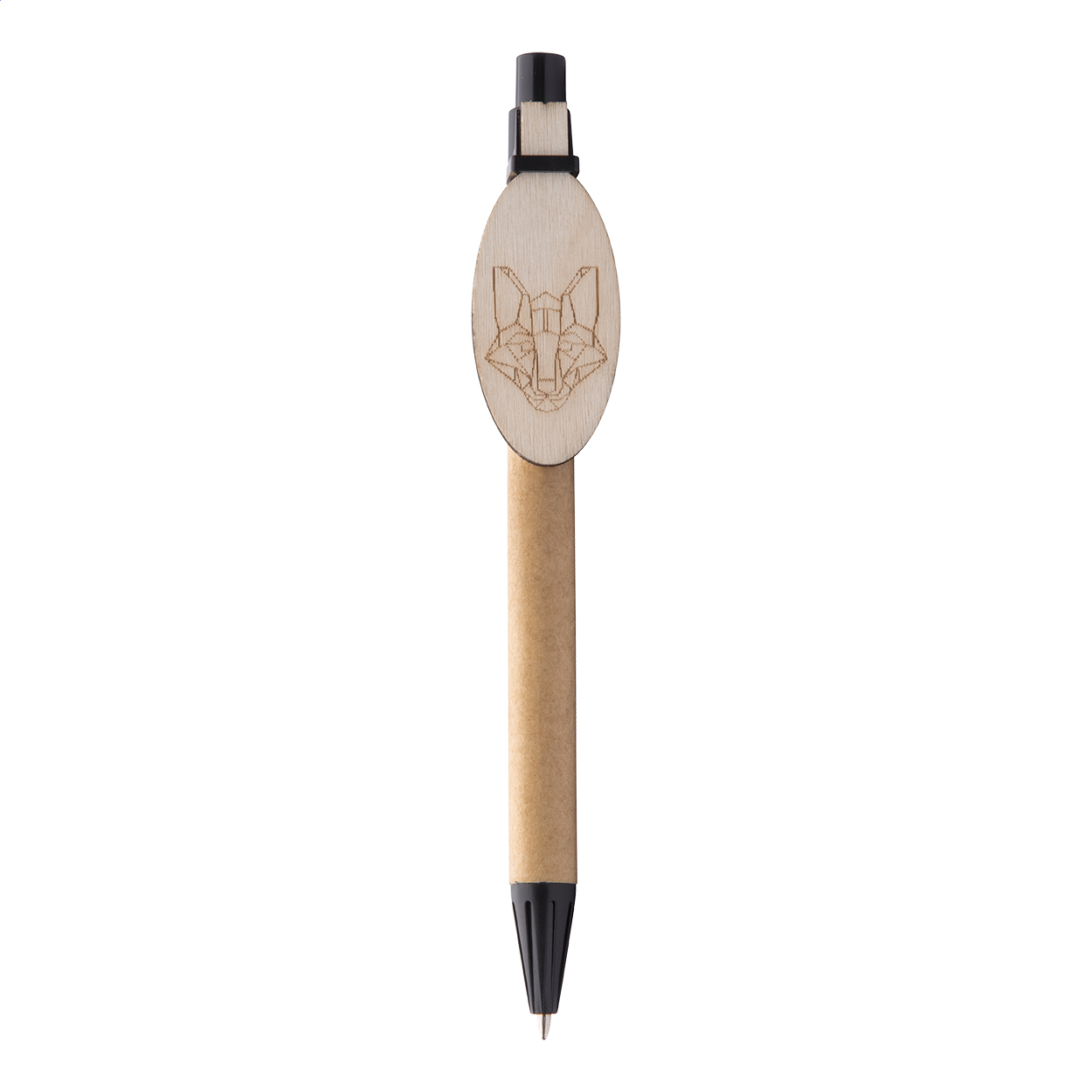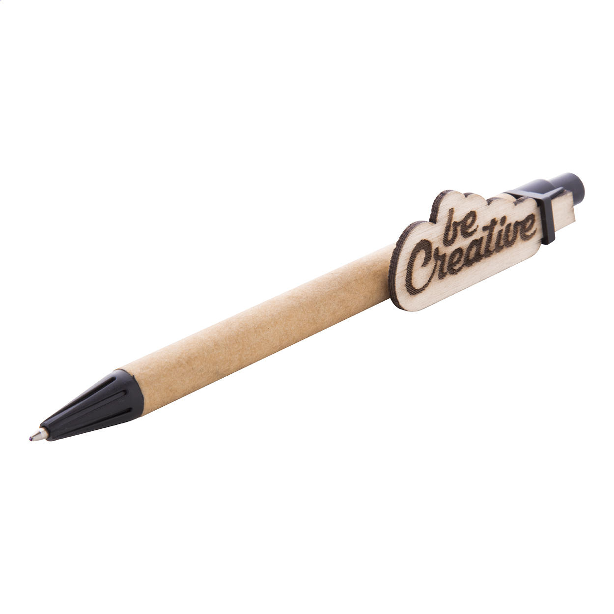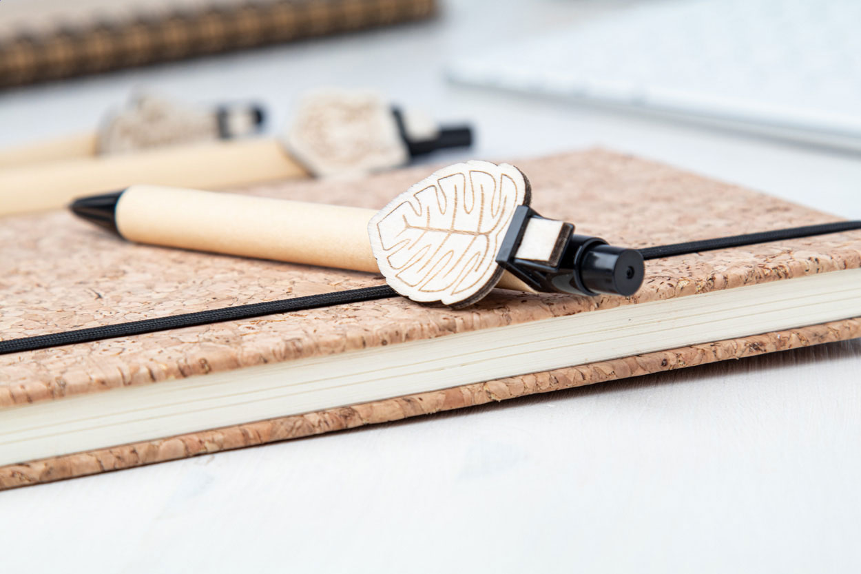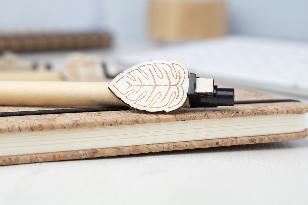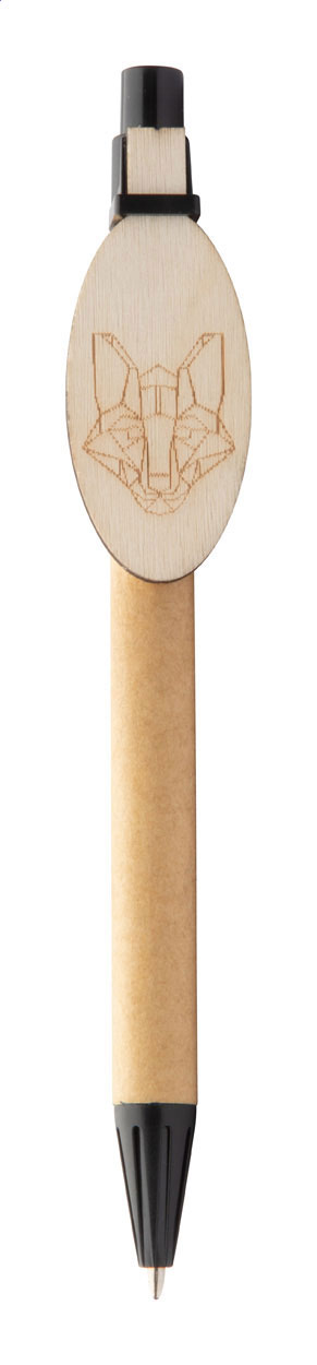 Recycled paper ballpoint pen with custom made plywood clip and blue refill. The clip is made in custom shape - maximum size: 25×35 mm. Price includes logo engraving on clip. MOQ: 100 pcs.