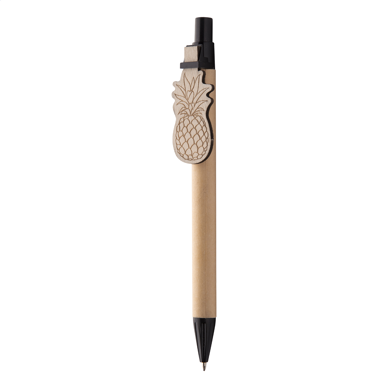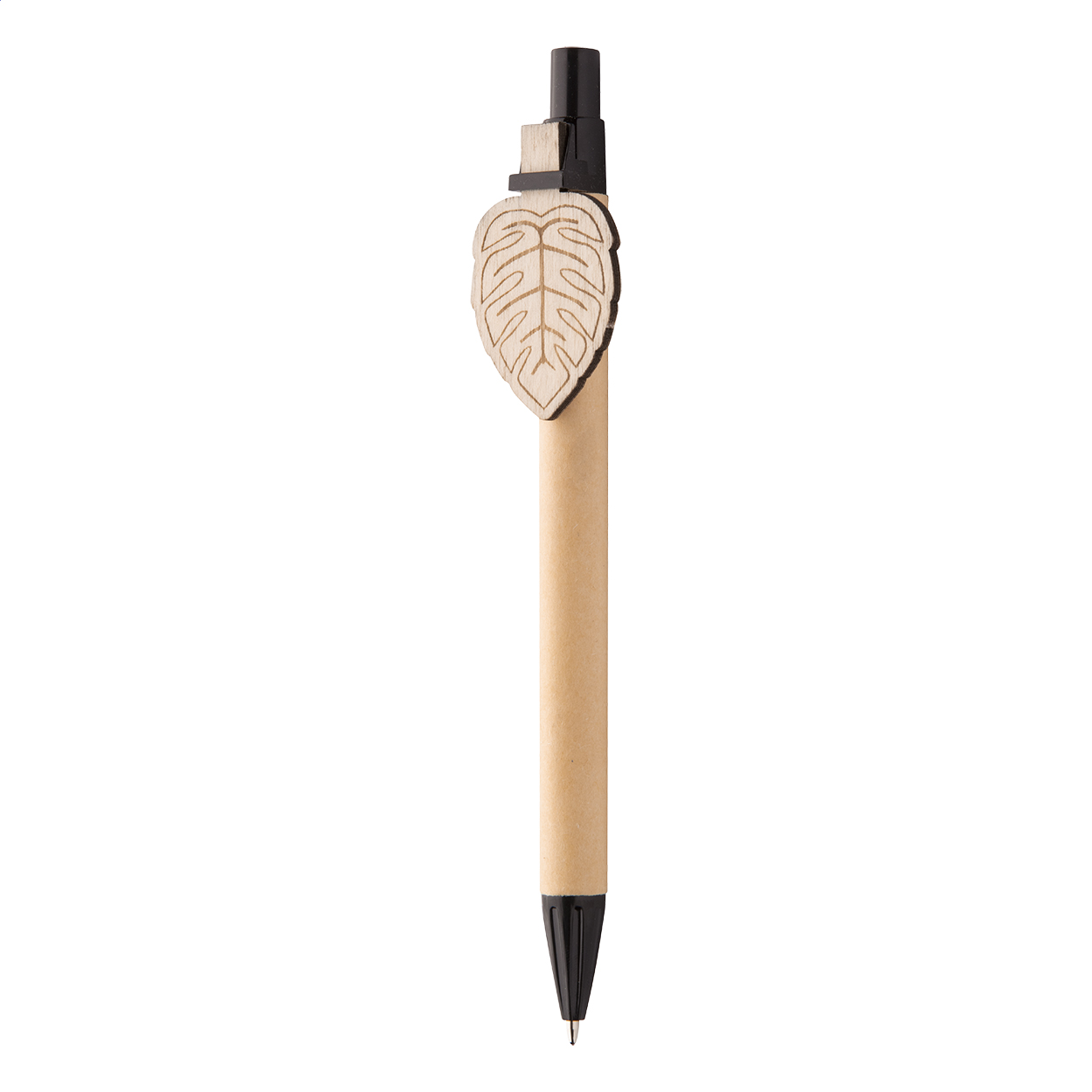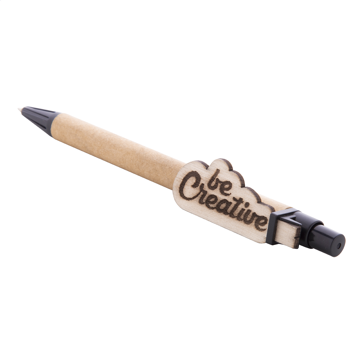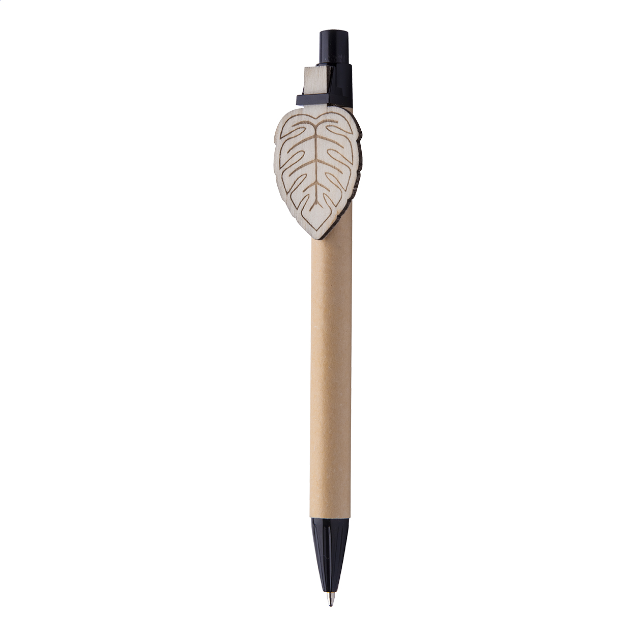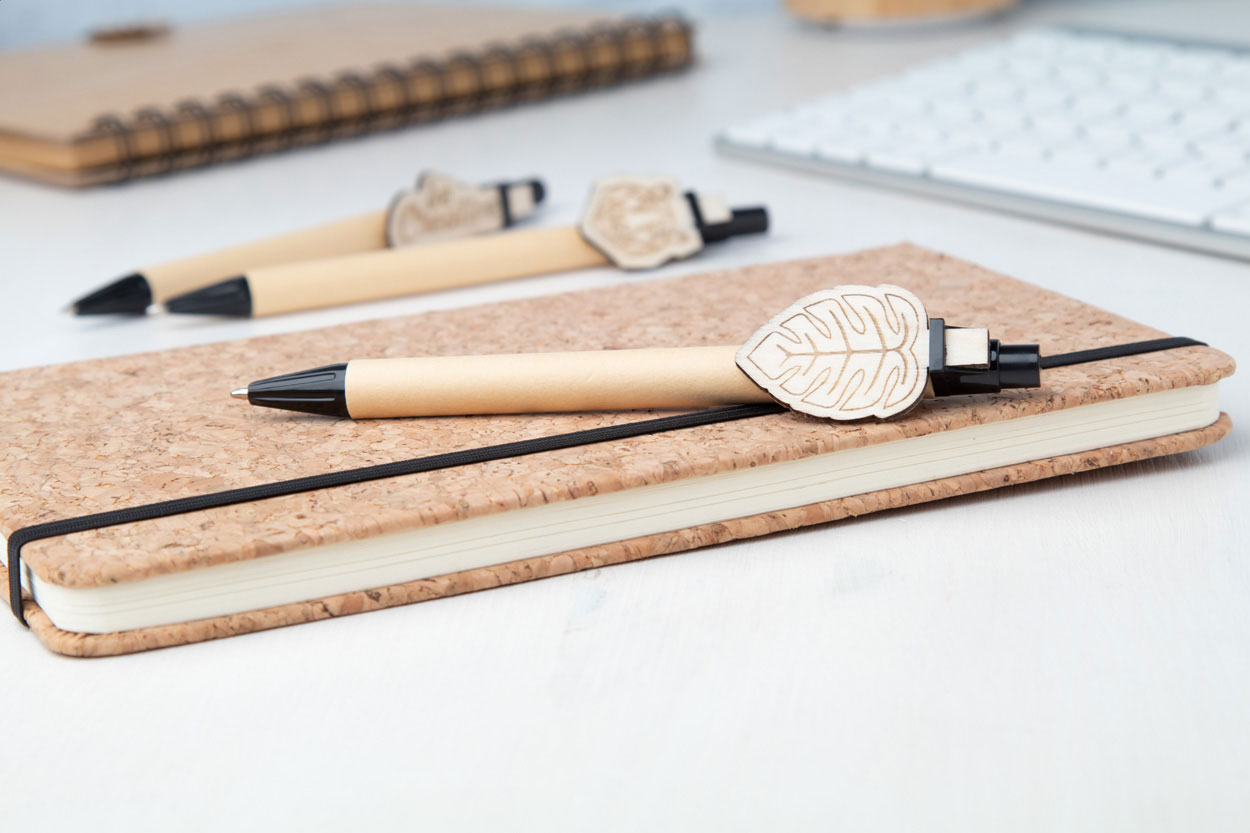 Recycled paper ballpoint pen with custom made plywood clip and blue refill. The clip is made in custom shape - maximum size: 25×35 mm. Price includes logo engraving on clip. MOQ: 100 pcs.