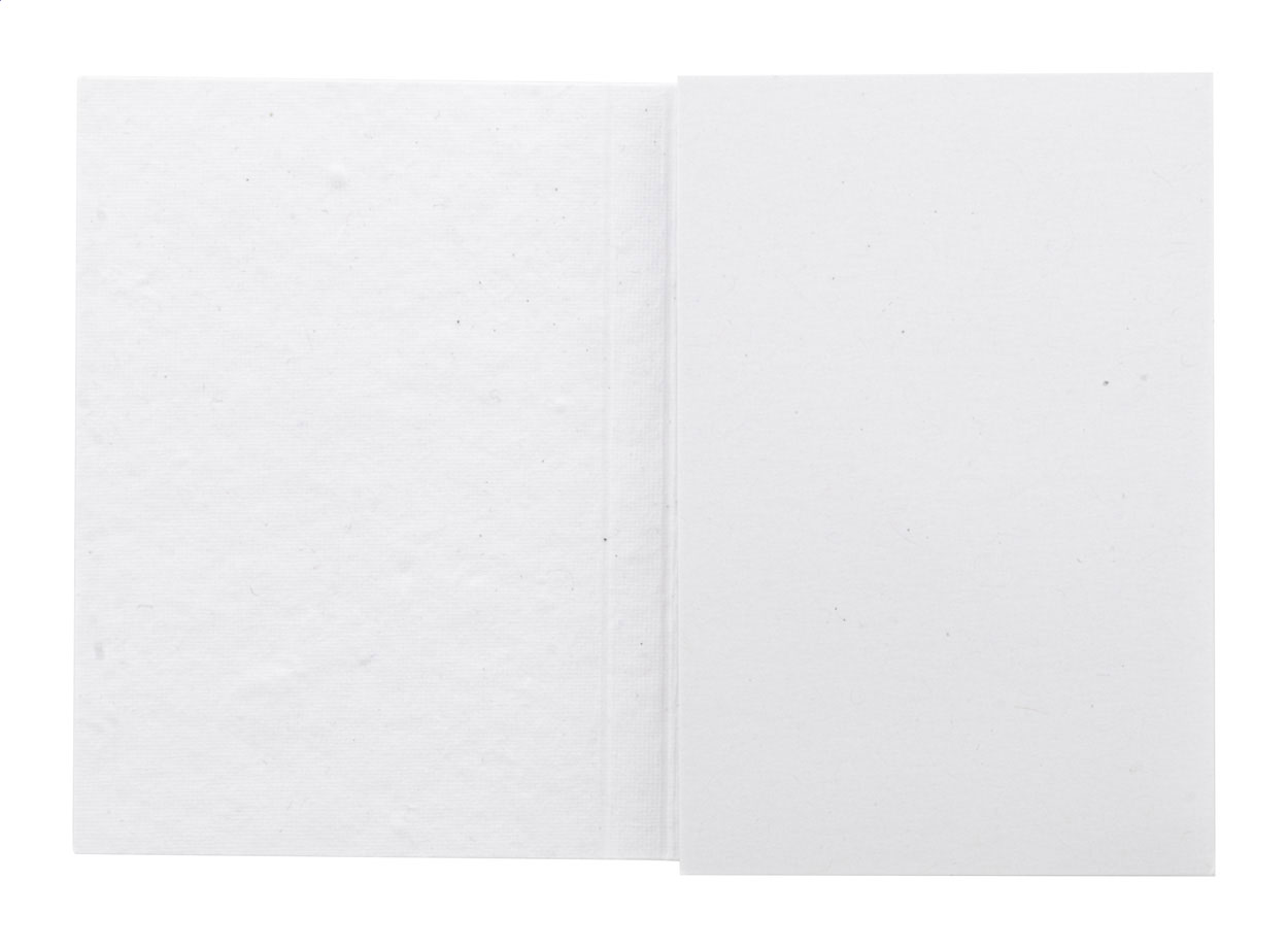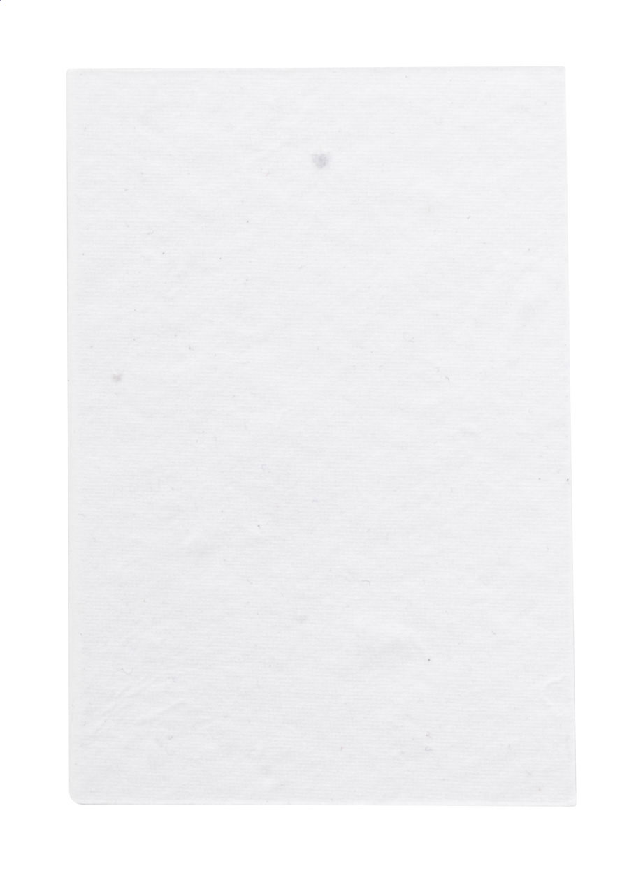 Custom made, seed paper covered sticky notepad. Includes 50 sheets of recycled paper sticky notes (50×75 mm). Price includes full colour printed outside cover. MOQ: 100 pcs. With assorted wildflower seeds.