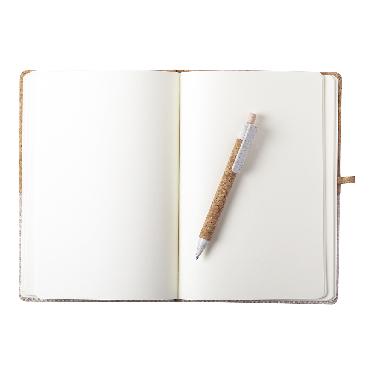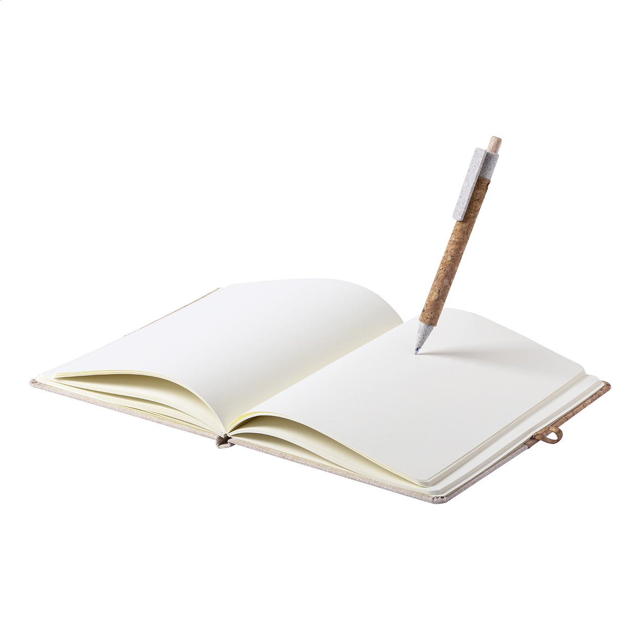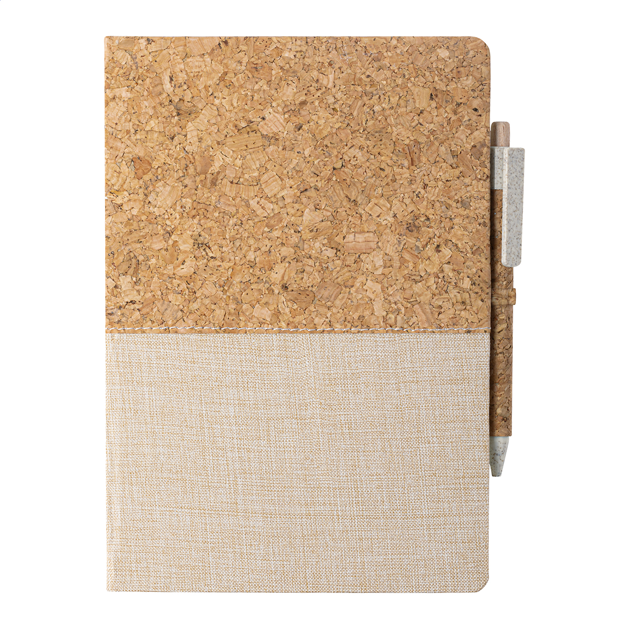 Natural cork and cotton covered notebook with 80 blank sheets. Including cork covered wheat straw plastic ballpoint pen with black refill. A5 size.