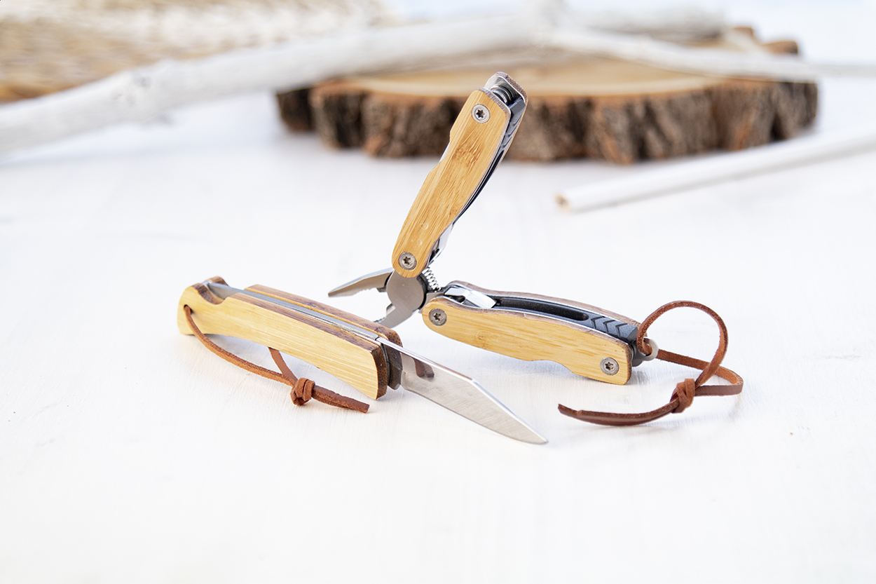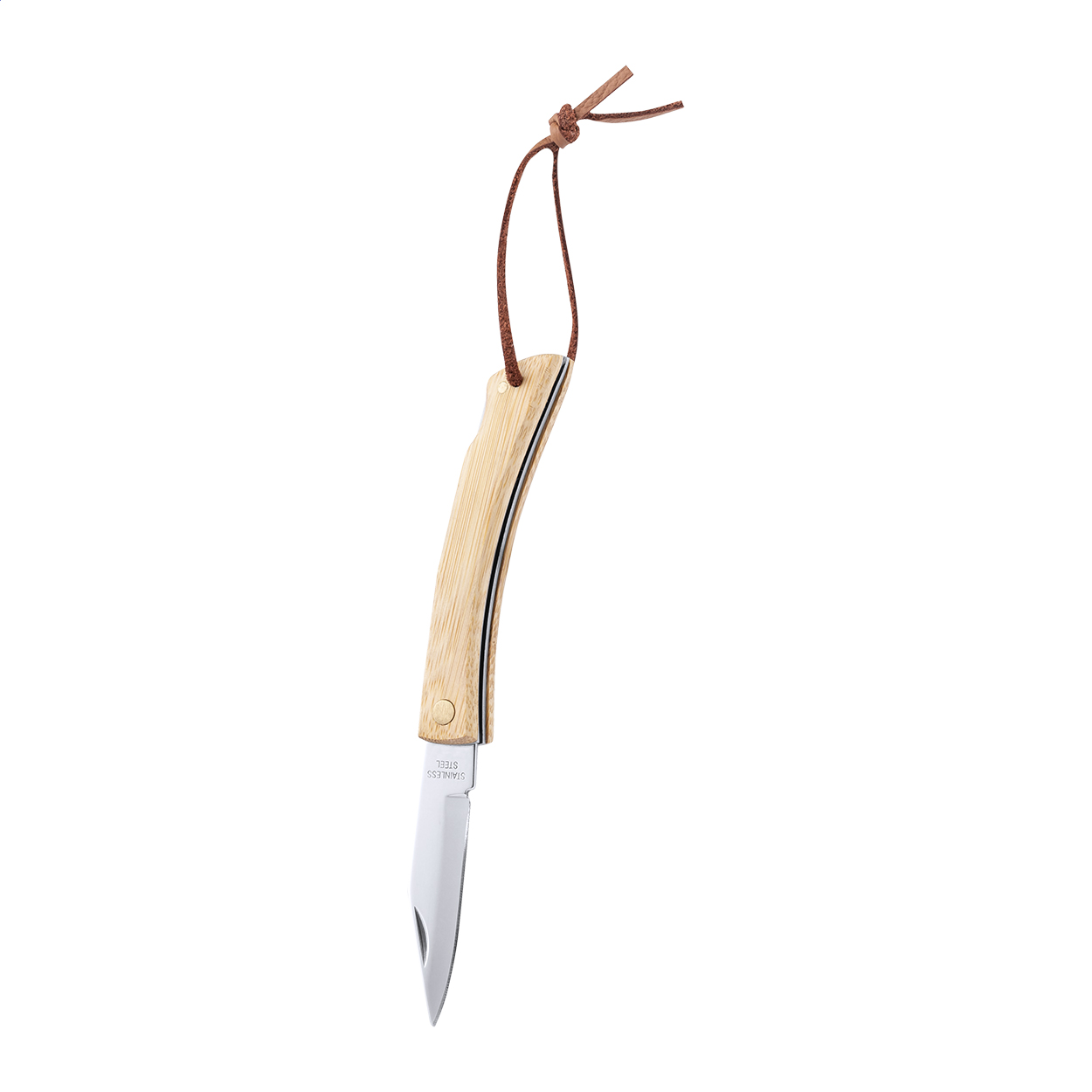 Stainless steel pocket knife with bamboo handle and PU leather carry strap. With safety lock.