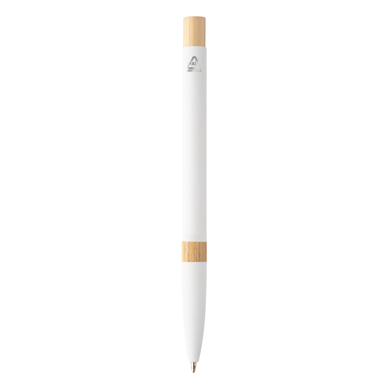Recycled aluminium ballpoint pen with bamboo parts, rubberized finish and chrome clip. With special coating for mirror laser engraving. With blue refill.