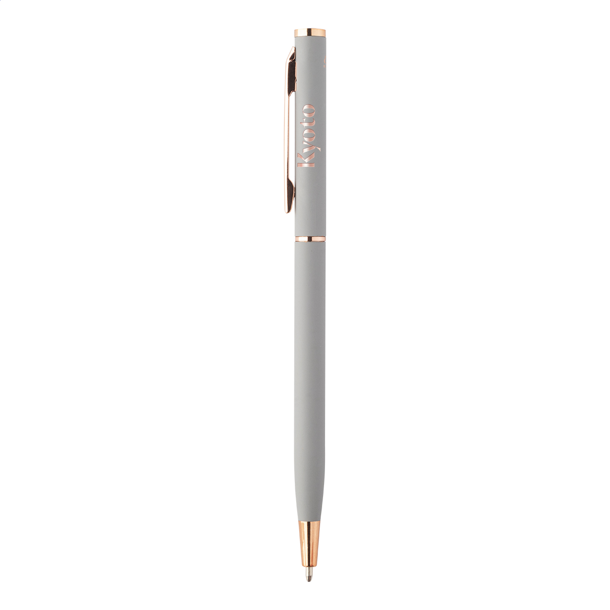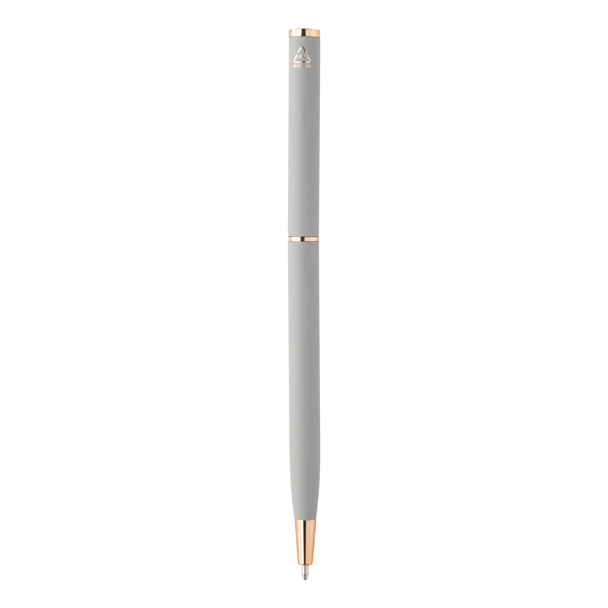 Recycled aluminium twist ballpoint pen with rubberized finish and rose gold details. With special coating for mirror laser engraving in rose gold colour. With blue refill.