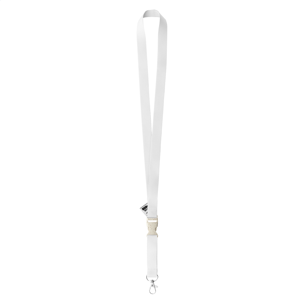 Custom made, RPET lanyard with detachable metal carabiner and wheat straw plastic buckle. With sublimation printed graphics on both sides. MOQ: 100 pcs.