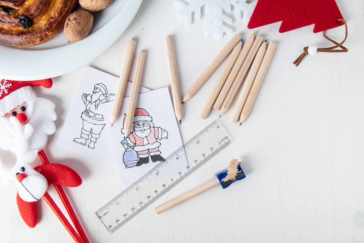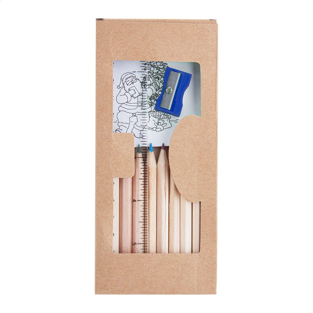 Drawing set with 10 pcs of colour pencils, 1 pc sharpener, 1 pc ruler and colouring book.