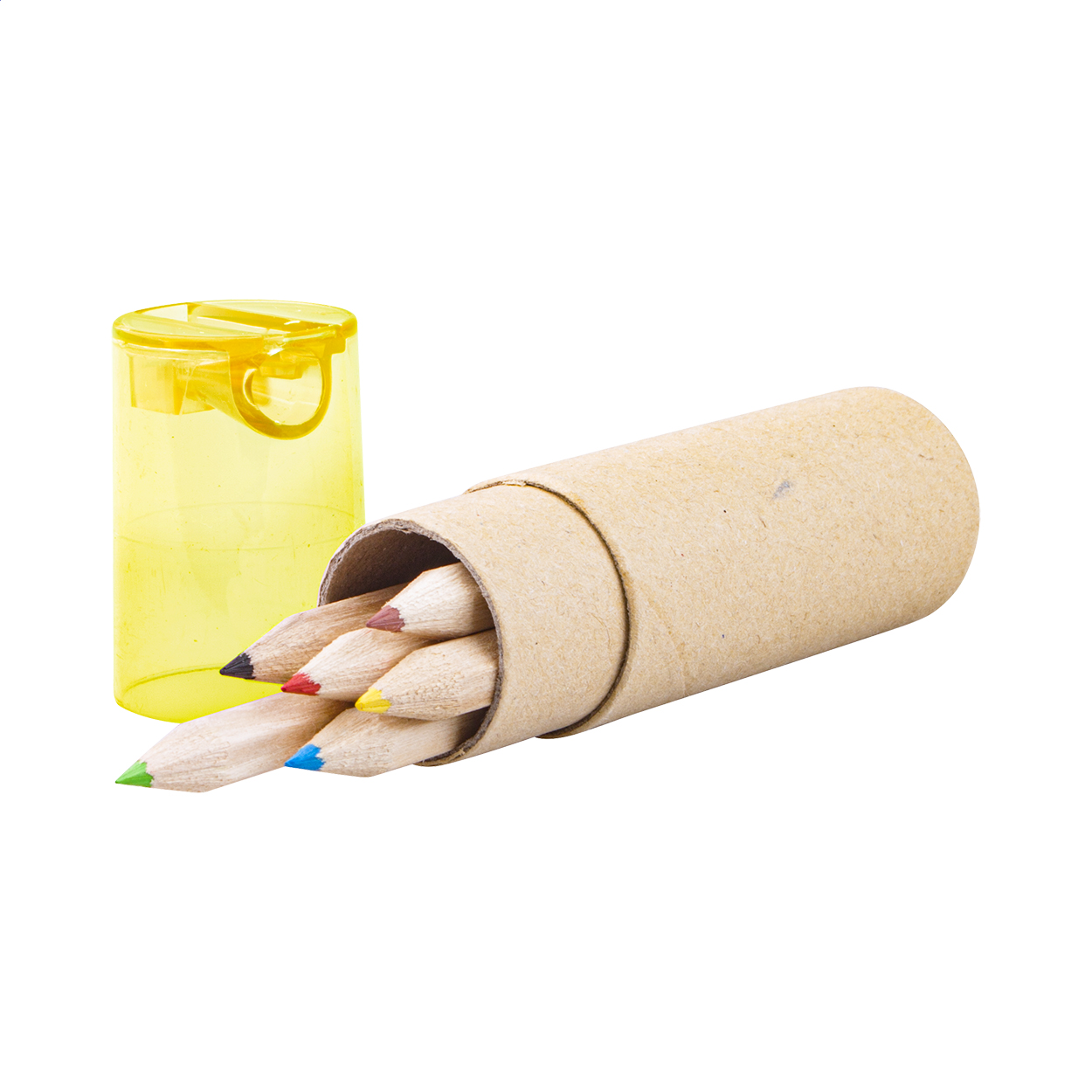 6 pc coloured pencil set in round cardboard case with plastic sharpener.