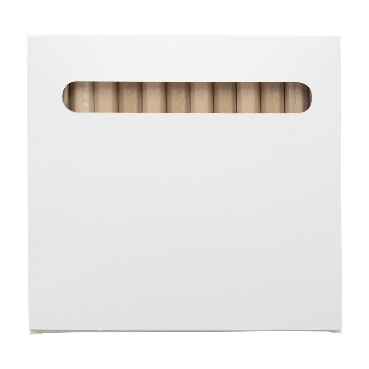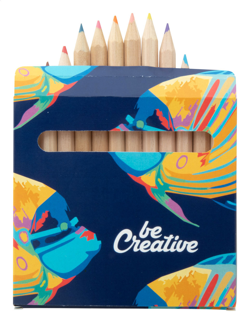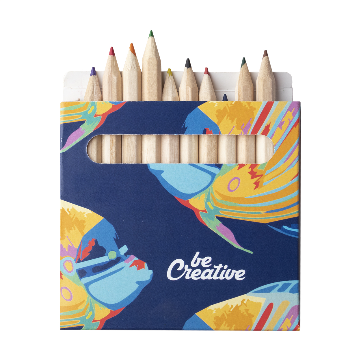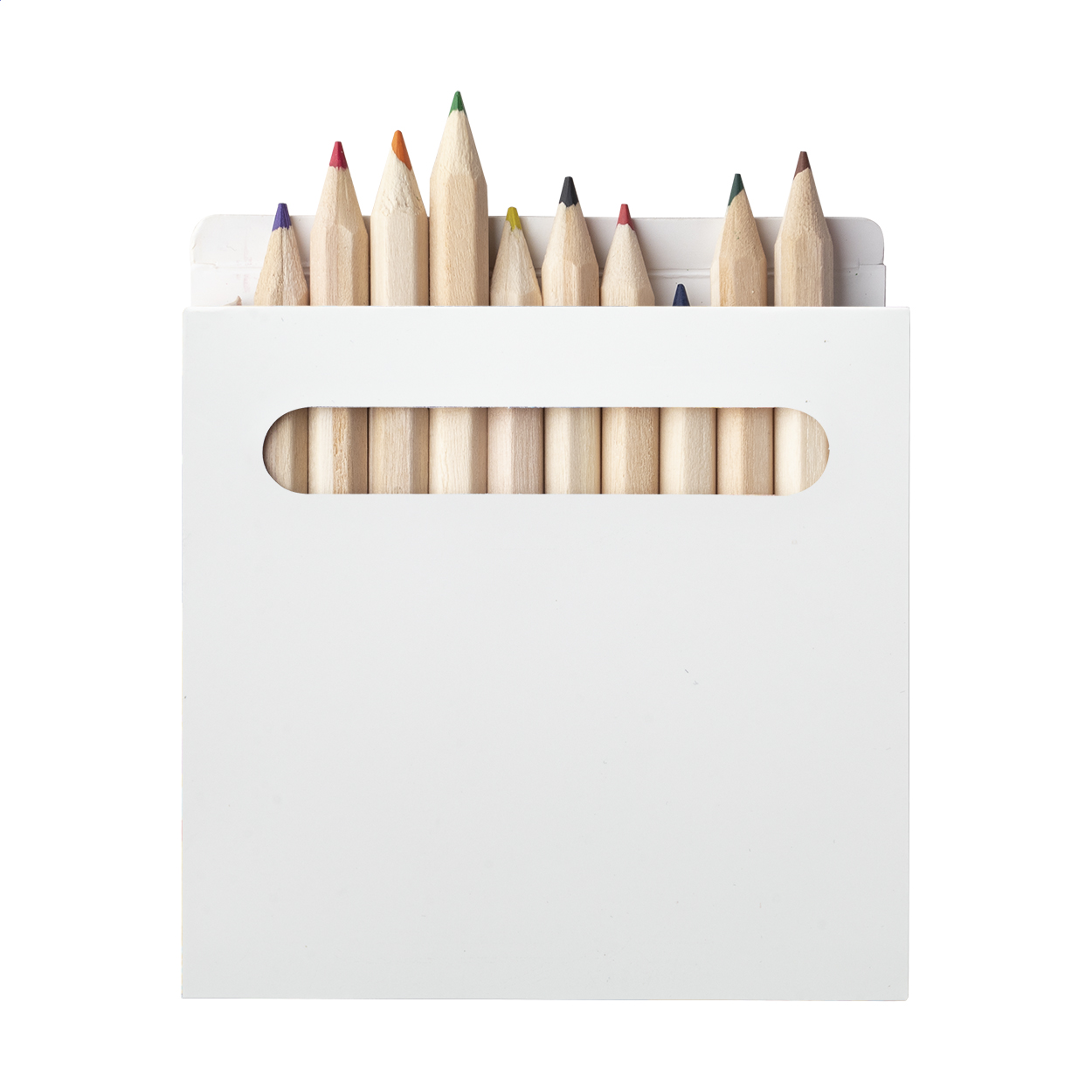 Wooden coloured pencils (12 pcs) in full colour printed paper box. Price includes digital printing. MOQ: 100 pcs.