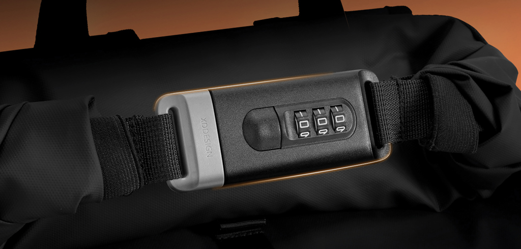 Urban Water Resistant Bike backpack stands as the ideal travel companion, ensuring security and convenience. By rolling up the main compartment and securing it with the reinforced combination lock, the backpack offers complete closure, which can also be used to lock the bag around a fixed object. The backpack easily attaches to your bike frame. Inside, padded compartments accommodate a 16” laptop, while mesh pockets keep your essentials organised. The minimalist exterior is crafted from high-quality, water-resistant, and durable PU material, while the lining is crafted with AWARE™, the use of genuine recycled fabric is guaranteed. 32% recycled content. Registered design®