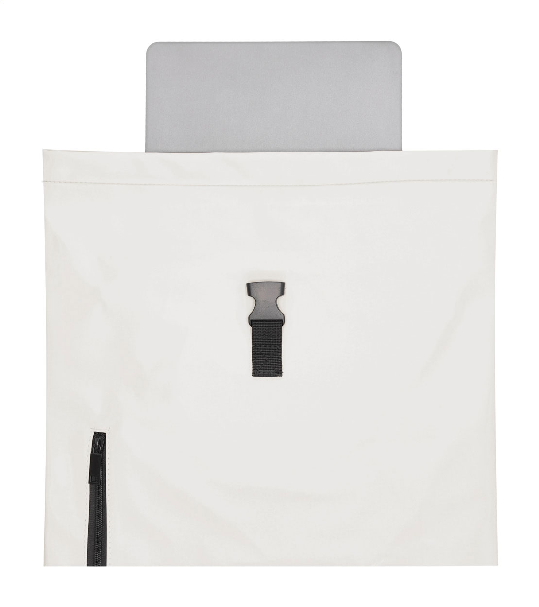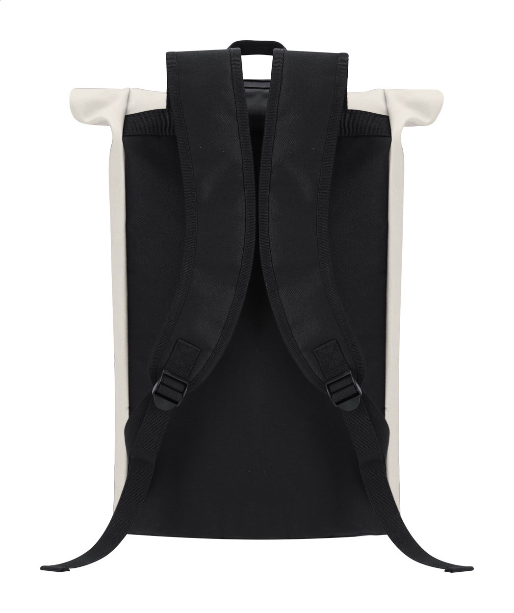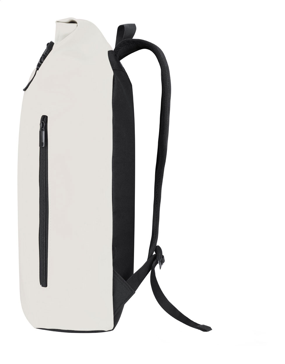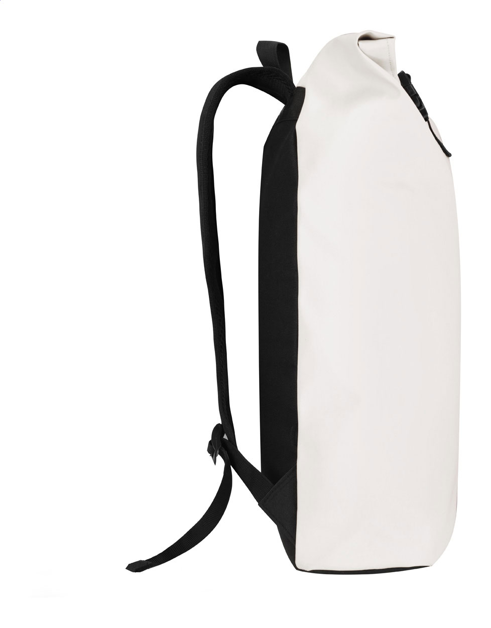 Soft PU leather rolltop backpack with buckle closure, padded laptop (15") compartment, padded back and shoulder straps.