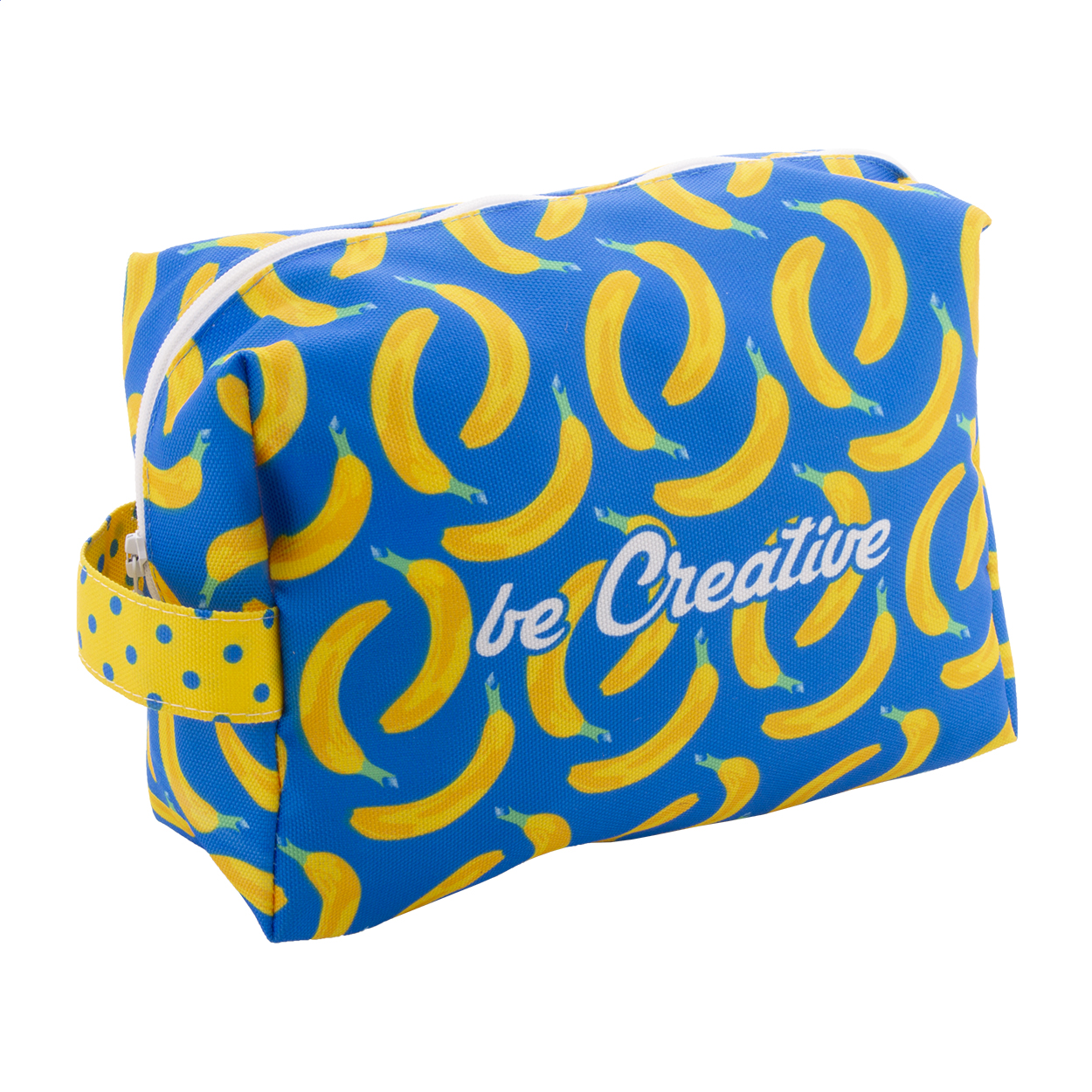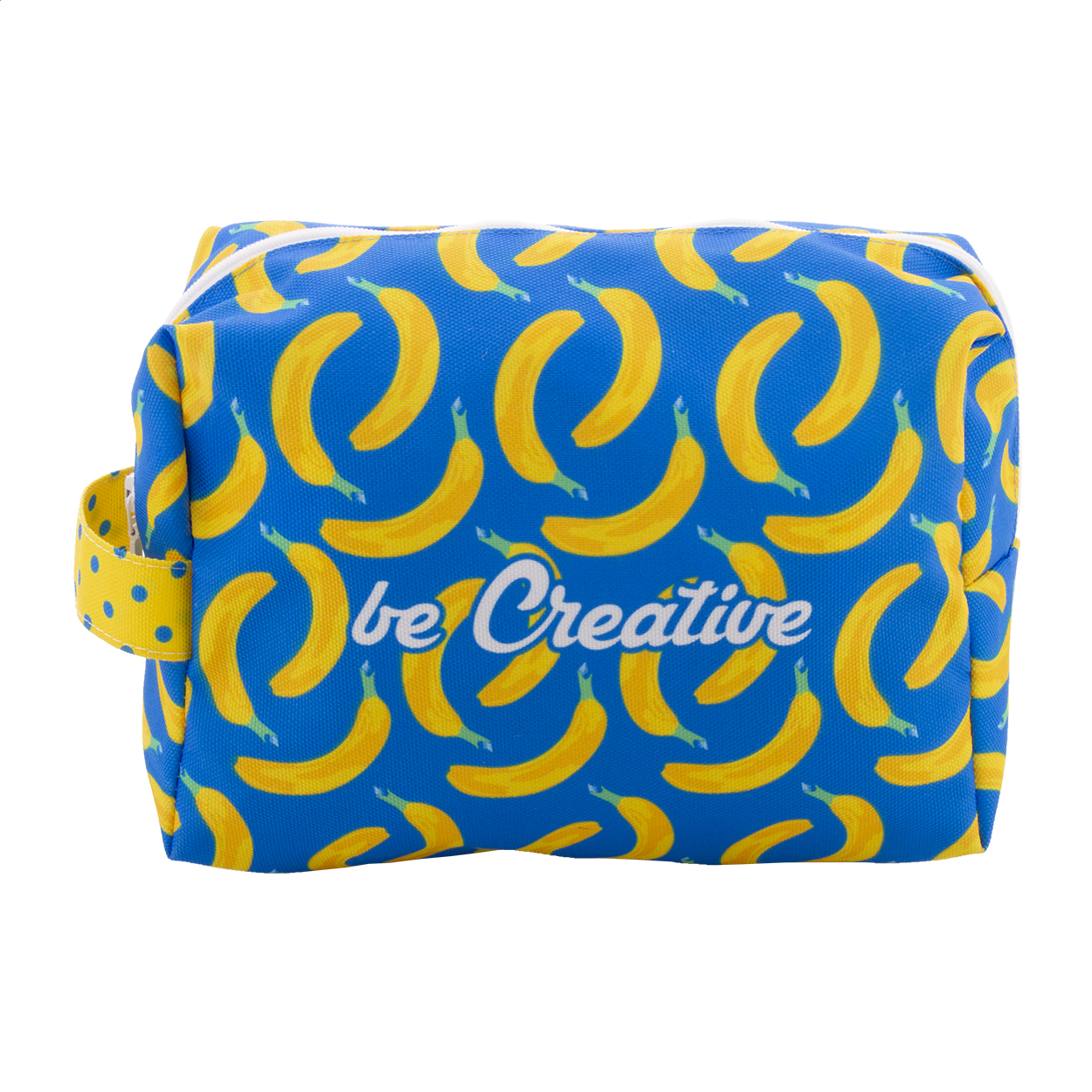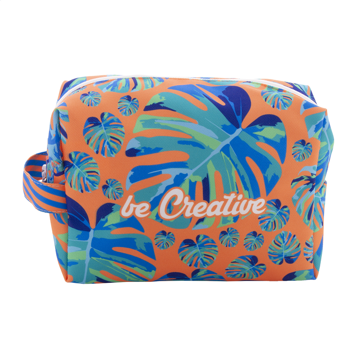 Custom made, zipped RPET cosmetic bag in 600D RPET polyester with carry handle. With all-over sublimation printed graphics. MOQ: 50 pcs.