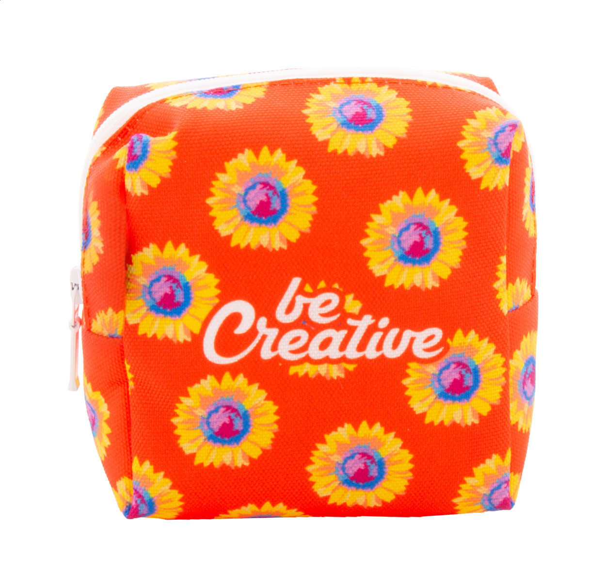 Custom made, square shaped zipped cosmetic bag in 600D RPET polyester. With all-over sublimation printed graphics. MOQ: 50 pcs.