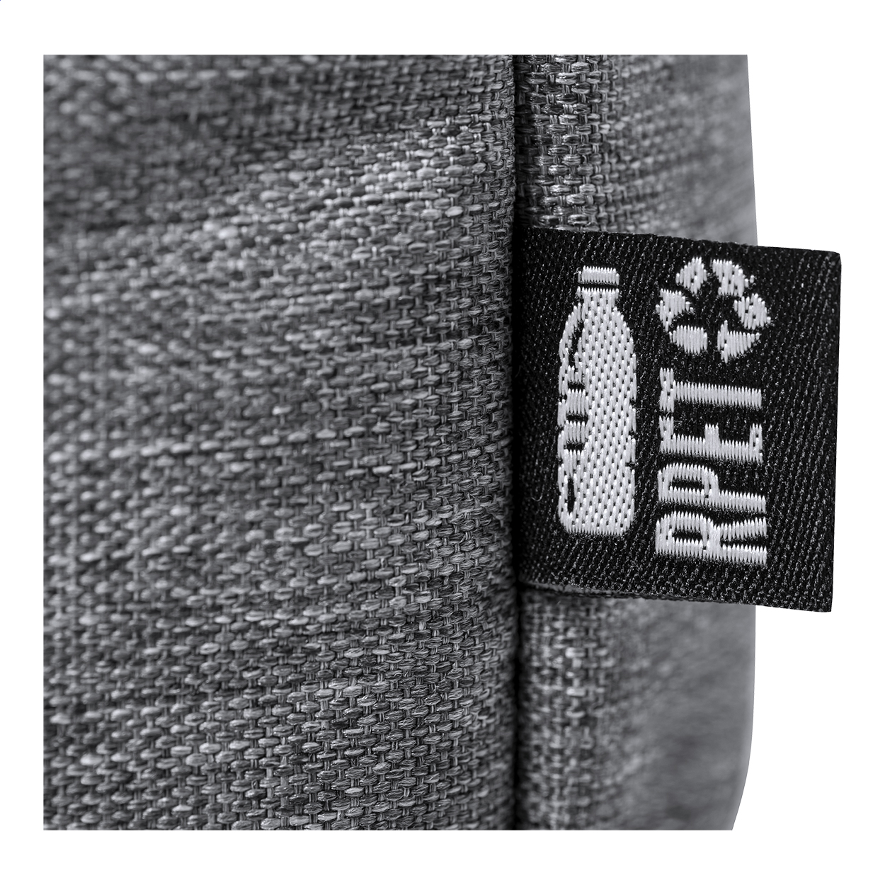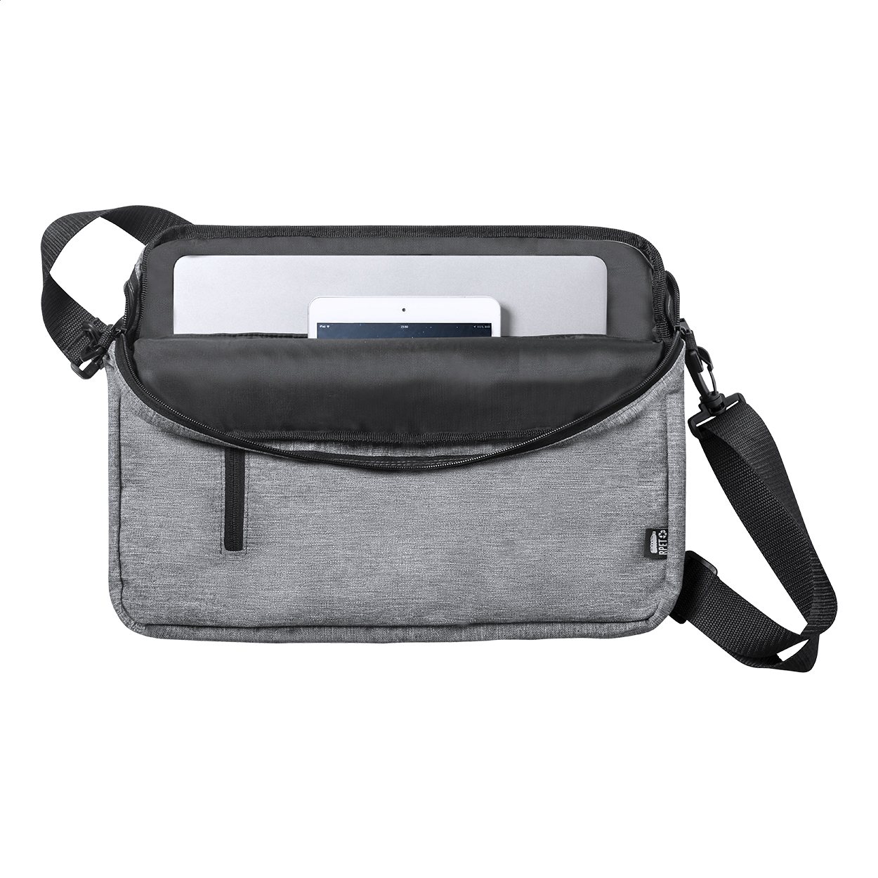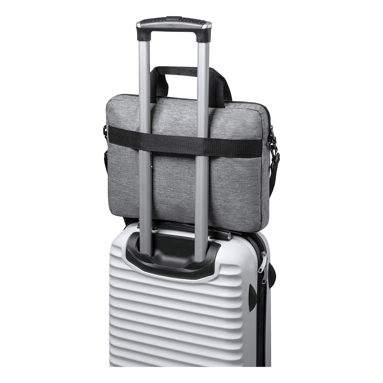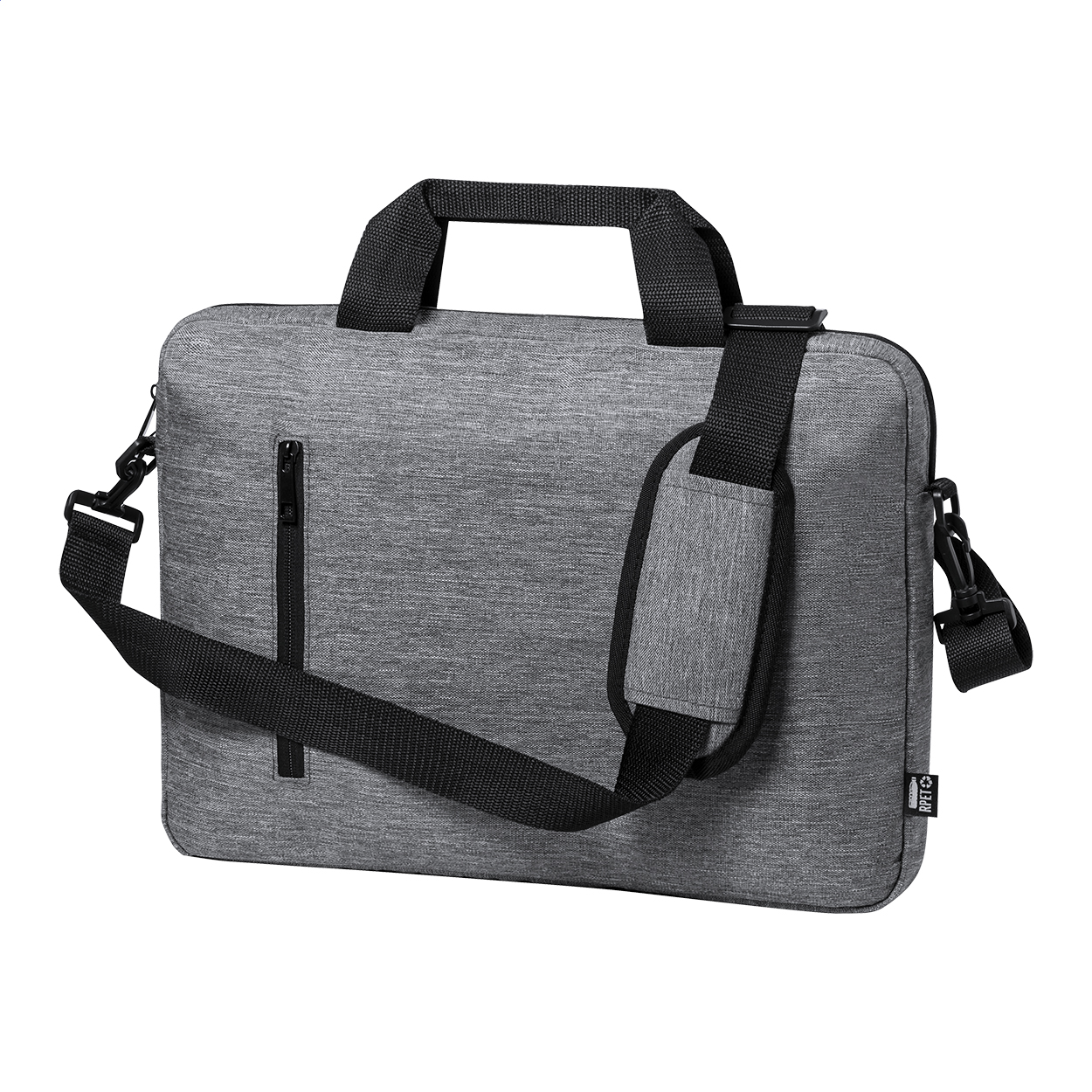 RPET document bag with zipped main compartment, adjustable shoulder strap, trolley strap, padded laptop (15") and tablet (10") compartments. 600D RPET polyester.