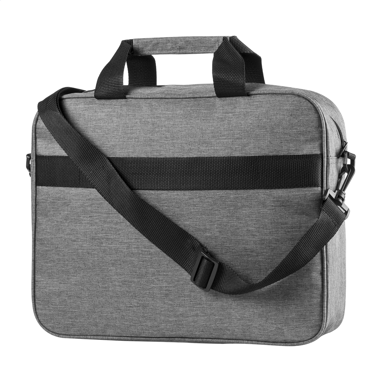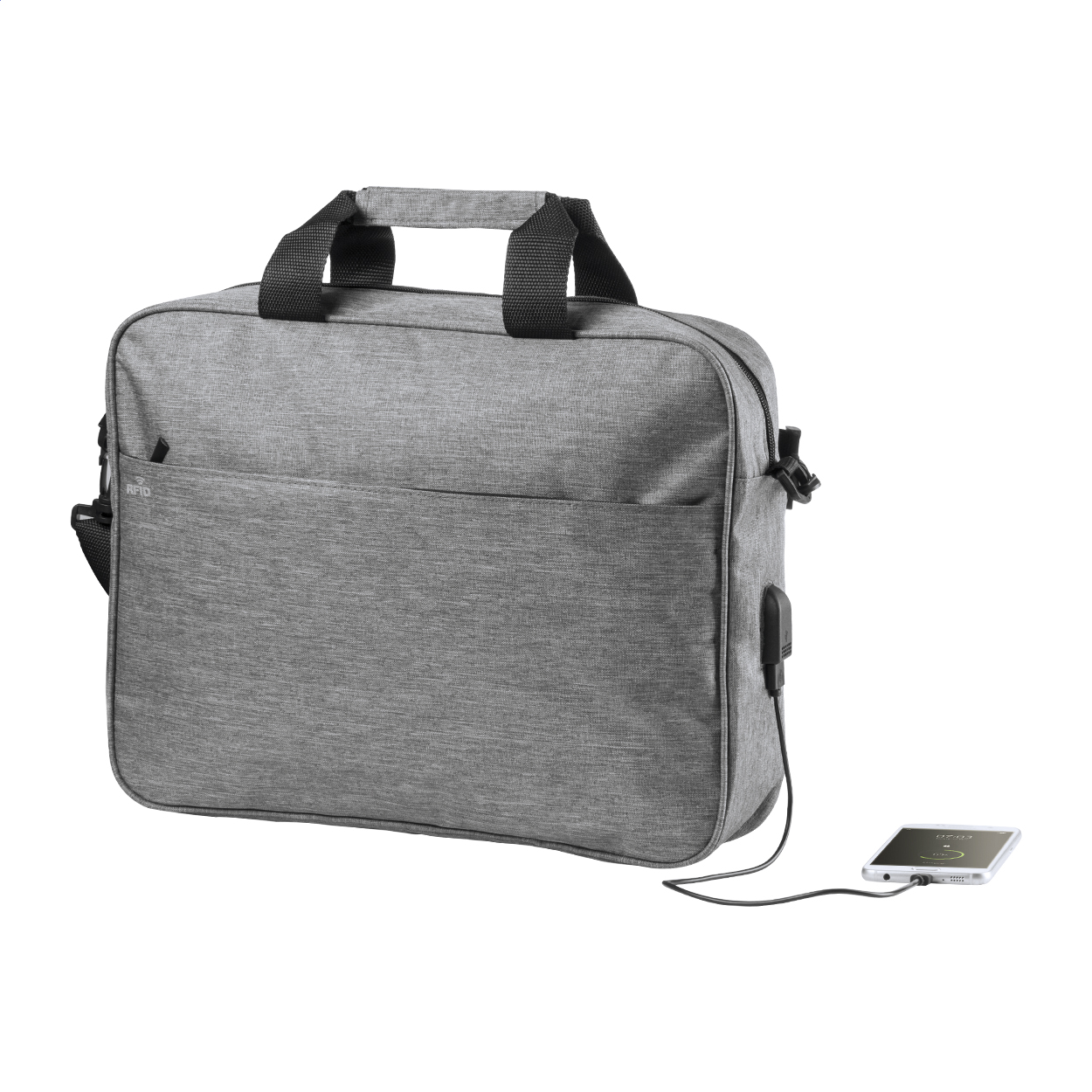 RFID protected document bag with padded laptop and tablet compartment (15" & 10"), padded back and shoulder strap. With built-in USB connection for power banks. 300D polyester.