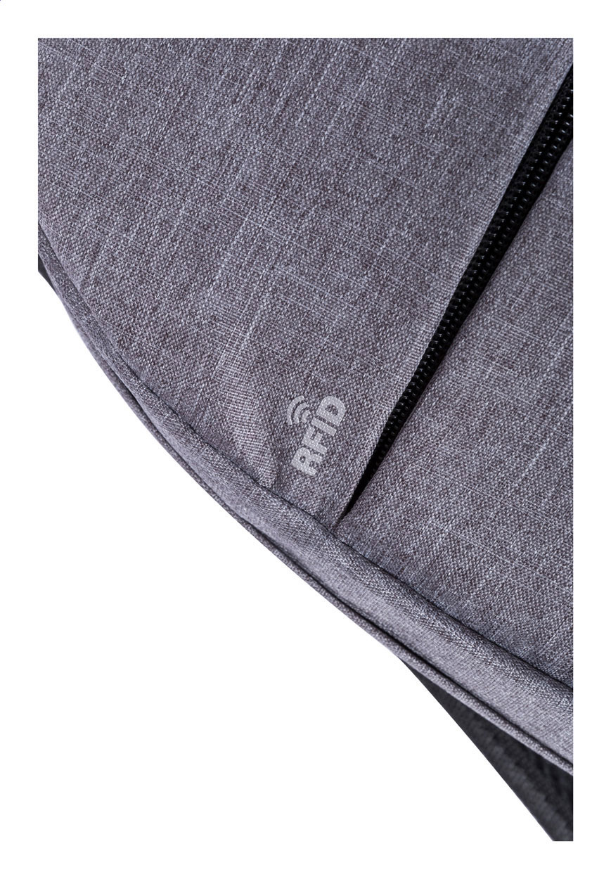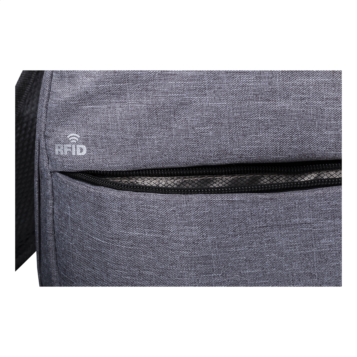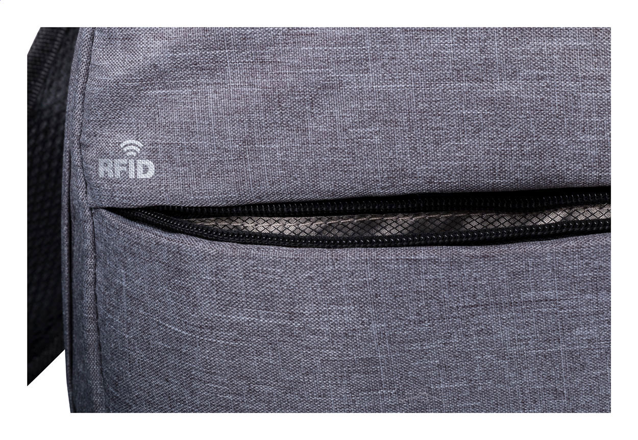 RFID protected backpack with multiple zipped compartments, padded laptop compartment (15"), padded back and shoulder strap. With built-in USB connection for power banks. 300D polyester.
